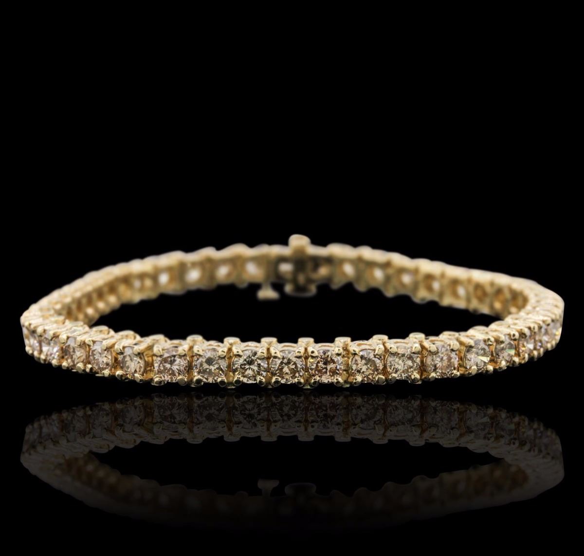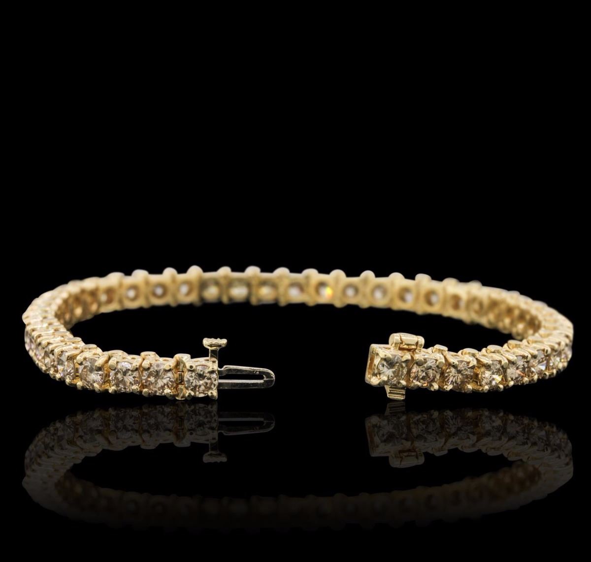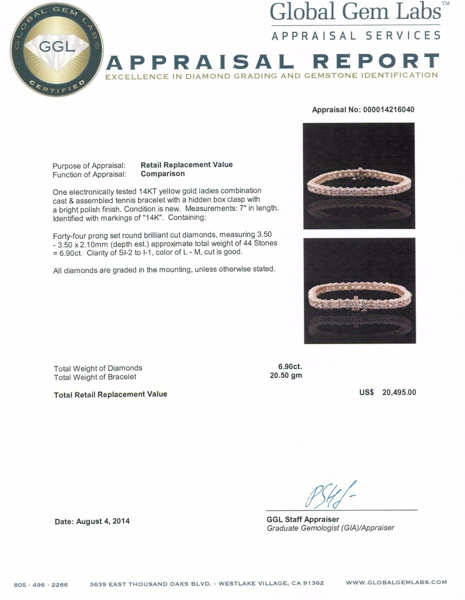 One electronically tested 14KT yellow gold ladies combination cast & assembled tennis bracelet with a hidden box clasp with a bright polish finish. Condition is new. Measurements: 7" in length. Identified with markings of "14K". Containing: Forty-Four prong set round brilliant cut diamonds, measuring 3.50 - 3.50 x 2.10mm (depth est.) approximate. Total Weight of 44 Stones = 6.90ct. Clarity: SI-2 to I-1. Color: L - M, Cut is Good. All diamonds are graded in the mounting, unless otherwise stated. Total Weight of Diamonds 6.90ct. Total Weight of Bracelet 20.50 grams. GGL Appraised at $20,495.00.