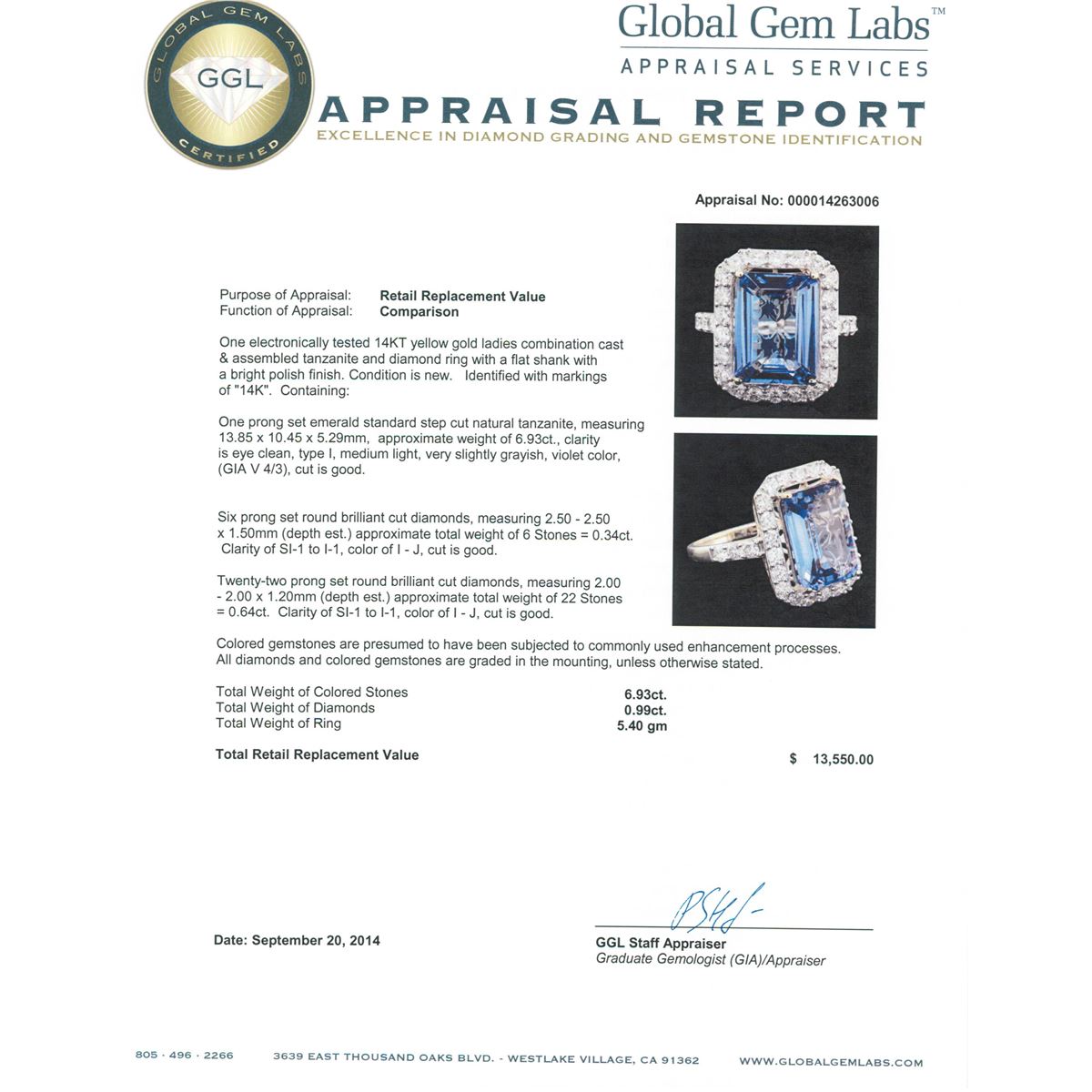 One electronically tested 14KT yellow gold ladies combination cast & assembled tanzanite and diamond ring with a flat shank with a bright polish finish. Identified with markings of "14K". Condition is new. Containing: One prong set emerald standard step cut natural tanzanite, measuring 13.85 x 10.45 x 5.29mm, approximate weight of 6.93ct., clarity is eye clean, type I, medium light, very slightly grayish, violet color, (GIA V 4/3), cut is good. Six prong set round brilliant cut diamonds, measuring 2.50 - 2.50 x 1.50mm (depth est.) approximate total weight of 6 Stones = 0.34ct. Clarity: SI-1 to I-1. Color: I - J, Cut is Good. Twenty-Two prong set round brilliant cut diamonds, measuring 2.00 - 2.00 x 1.20mm (depth est.) approximate total weight of 22 Stones = 0.64ct. Clarity: SI-1 to I-1. Color: I - J, Cut is Good. Colored gemstones are presumed to have been subjected to commonly used enhancement processes. All diamonds and colored gemstones are graded in the mounting, unless otherwise stated. Total Weight of Colored Stones 6.93ct. Total Weight of Diamonds 0.99ct. Total Weight of Ring 5.40 grams. GGL Appraised at $13,550.00.