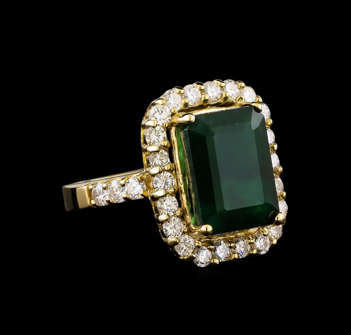 One electronically tested 14KT yellow gold ladies cast emerald and diamond ring with a bright polish finish. Identified with markings of "K14". Condition is new. Containing: One prong set emerald standard step cut natural emerald, measuring 13.40 x 10.40 x 6.80mm, approximate weight of 6.96ct., clarity is severely included, type III, dark, moderately strong, green color, (GIA G 7/4), cut is good. Twenty-Eight prong set round brilliant cut diamonds, measuring 2.50 - 2.50 x 1.50mm (depth est.) approximate total weight of 28 Stones = 1.60ct. Clarity: SI-1. Color: G - H, Cut is Good. Colored gemstones are presumed to have been subjected to commonly used enhancement processes. All diamonds and colored gemstones are graded in the mounting, unless otherwise stated. Total Weight of Colored Stones 6.96ct. Total Weight of Diamonds 1.60ct. Total Weight of Ring 11.30 grams. GGL Appraised at $9,130.00.