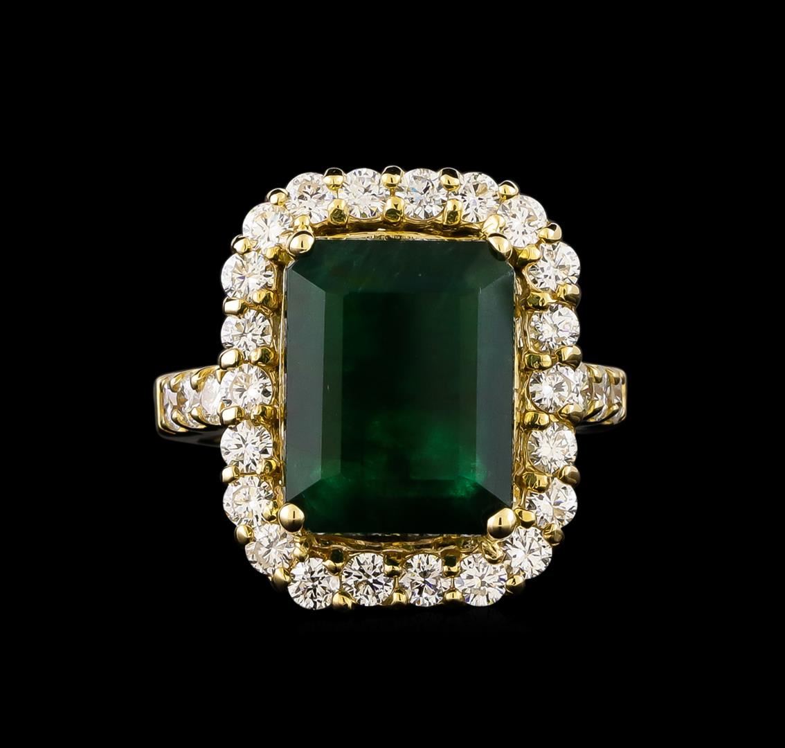 One electronically tested 14KT yellow gold ladies cast emerald and diamond ring with a bright polish finish. Identified with markings of "K14". Condition is new. Containing: One prong set emerald standard step cut natural emerald, measuring 13.40 x 10.40 x 6.80mm, approximate weight of 6.96ct., clarity is severely included, type III, dark, moderately strong, green color, (GIA G 7/4), cut is good. Twenty-Eight prong set round brilliant cut diamonds, measuring 2.50 - 2.50 x 1.50mm (depth est.) approximate total weight of 28 Stones = 1.60ct. Clarity: SI-1. Color: G - H, Cut is Good. Colored gemstones are presumed to have been subjected to commonly used enhancement processes. All diamonds and colored gemstones are graded in the mounting, unless otherwise stated. Total Weight of Colored Stones 6.96ct. Total Weight of Diamonds 1.60ct. Total Weight of Ring 11.30 grams. GGL Appraised at $9,130.00.