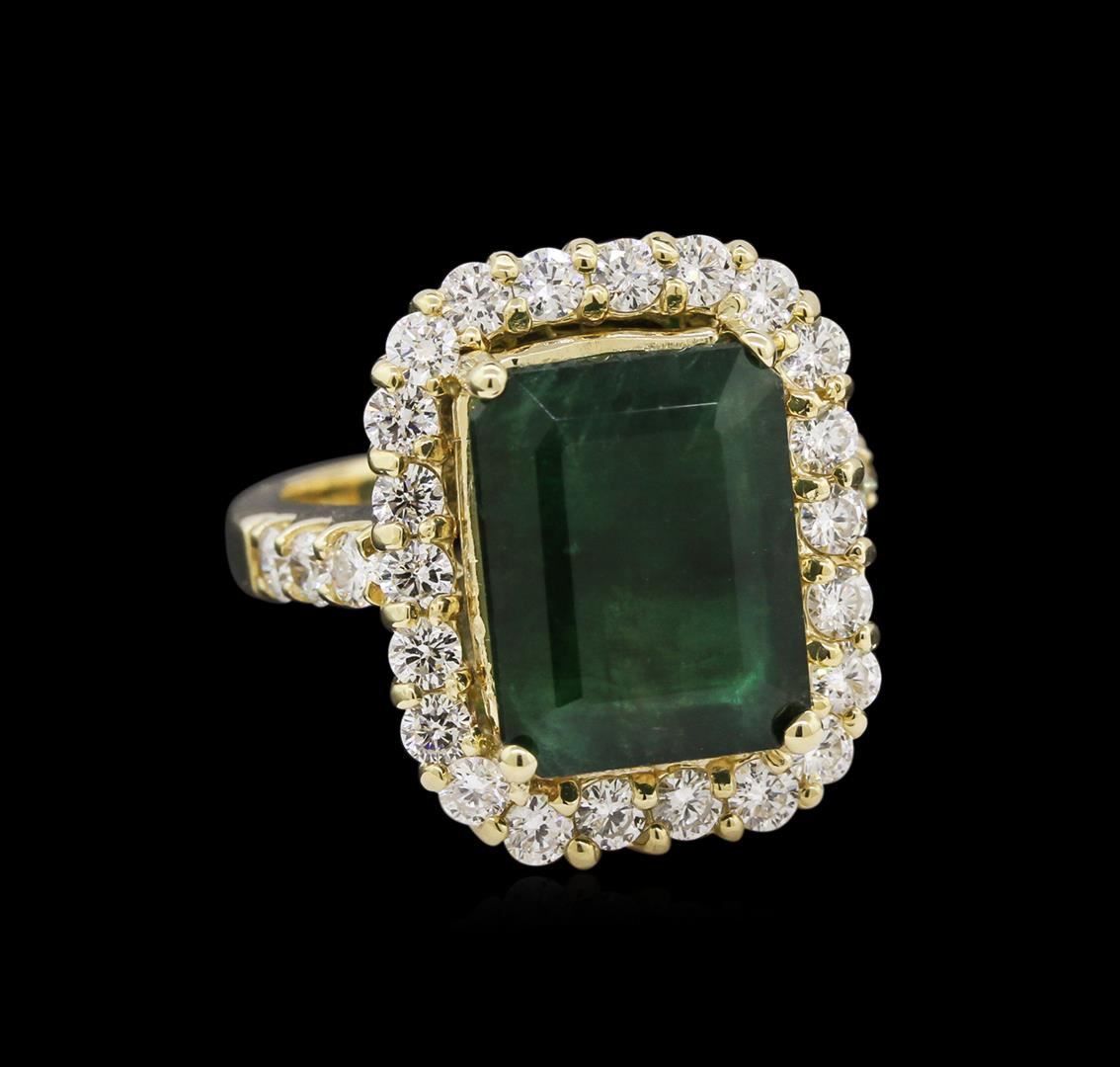 One electronically tested 14KT yellow gold ladies cast emerald and diamond ring with a bright polish finish. Identified with markings of "K14". Condition is new. Containing: One prong set emerald standard step cut natural emerald, measuring 13.40 x 10.40 x 6.80mm, approximate weight of 6.96ct., clarity is severely included, type III, dark, moderately strong, green color, (GIA G 7/4), cut is good. Twenty-Eight prong set round brilliant cut diamonds, measuring 2.50 - 2.50 x 1.50mm (depth est.) approximate total weight of 28 Stones = 1.60ct. Clarity: SI-1. Color: G - H, Cut is Good. Colored gemstones are presumed to have been subjected to commonly used enhancement processes. All diamonds and colored gemstones are graded in the mounting, unless otherwise stated. Total Weight of Colored Stones 6.96ct. Total Weight of Diamonds 1.60ct. Total Weight of Ring 11.30 grams. GGL Appraised at $9,130.00.