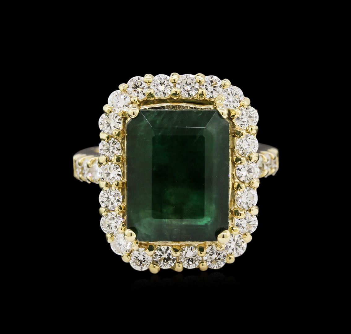One electronically tested 14KT yellow gold ladies cast emerald and diamond ring with a bright polish finish. Identified with markings of "K14". Condition is new. Containing: One prong set emerald standard step cut natural emerald, measuring 13.40 x 10.40 x 6.80mm, approximate weight of 6.96ct., clarity is severely included, type III, dark, moderately strong, green color, (GIA G 7/4), cut is good. Twenty-Eight prong set round brilliant cut diamonds, measuring 2.50 - 2.50 x 1.50mm (depth est.) approximate total weight of 28 Stones = 1.60ct. Clarity: SI-1. Color: G - H, Cut is Good. Colored gemstones are presumed to have been subjected to commonly used enhancement processes. All diamonds and colored gemstones are graded in the mounting, unless otherwise stated. Total Weight of Colored Stones 6.96ct. Total Weight of Diamonds 1.60ct. Total Weight of Ring 11.30 grams. GGL Appraised at $9,130.00.