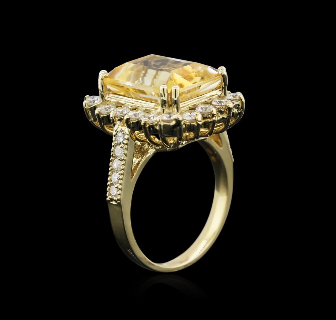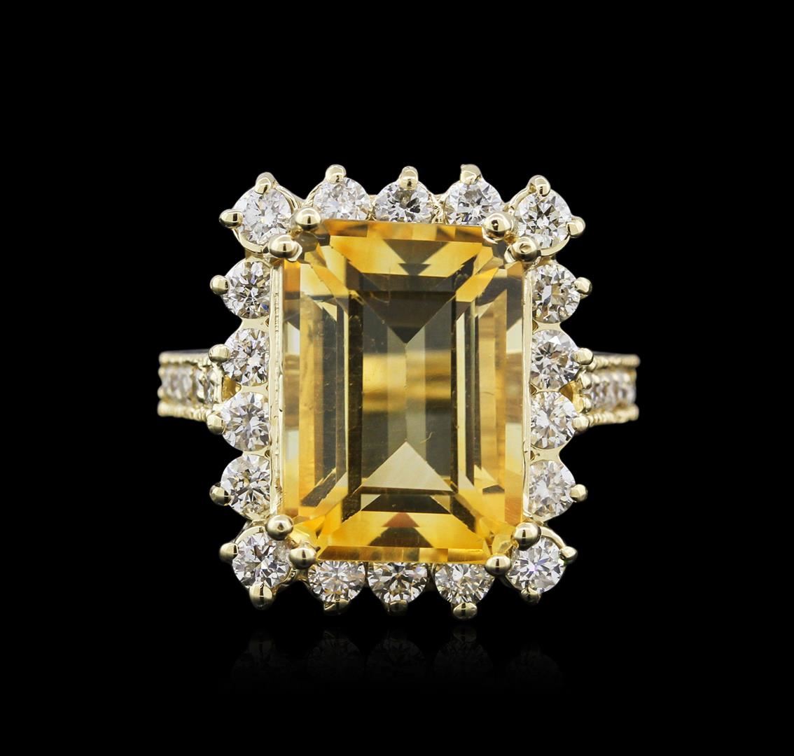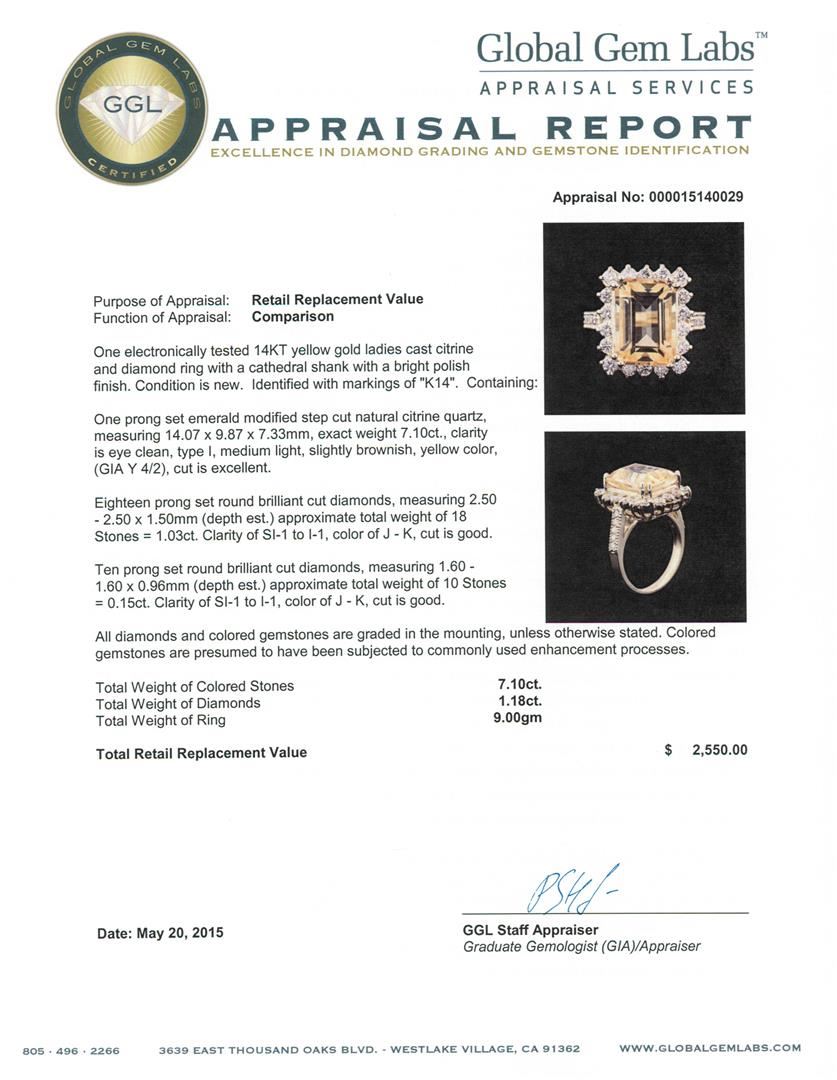 One electronically tested 14KT yellow gold ladies cast citrine and diamond ring with a cathedral shank with a bright polish finish. Identified with markings of "K14". Condition is new. Containing: One prong set emerald modified step cut natural citrine quartz, measuring 14.07 x 9.87 x 7.33mm, exact weight 7.10ct., clarity is eye clean, type I, medium light, slightly brownish, yellow color, (GIA Y 4/2), cut is excellent. Eighteen prong set round brilliant cut diamonds, measuring 2.50 - 2.50 x 1.50mm (depth est.) approximate total weight of 18 Stones = 1.03ct. Clarity: SI-1 to I-1. Color: J - K, Cut is Good. Ten prong set round brilliant cut diamonds, measuring 1.60 - 1.60 x 0.96mm (depth est.) approximate total weight of 10 Stones = 0.15ct. Clarity: SI-1 to I-1. Color: J - K, Cut is Good. All diamonds and colored gemstones are graded in the mounting, unless otherwise stated. Colored gemstones are presumed to have been subjected to commonly used enhancement processes. Total Weight of Colored Stones 7.10ct. Total Weight of Diamonds 1.18ct. Total Weight of Ring 9.00 grams. GGL Appraised at $2,550.00.