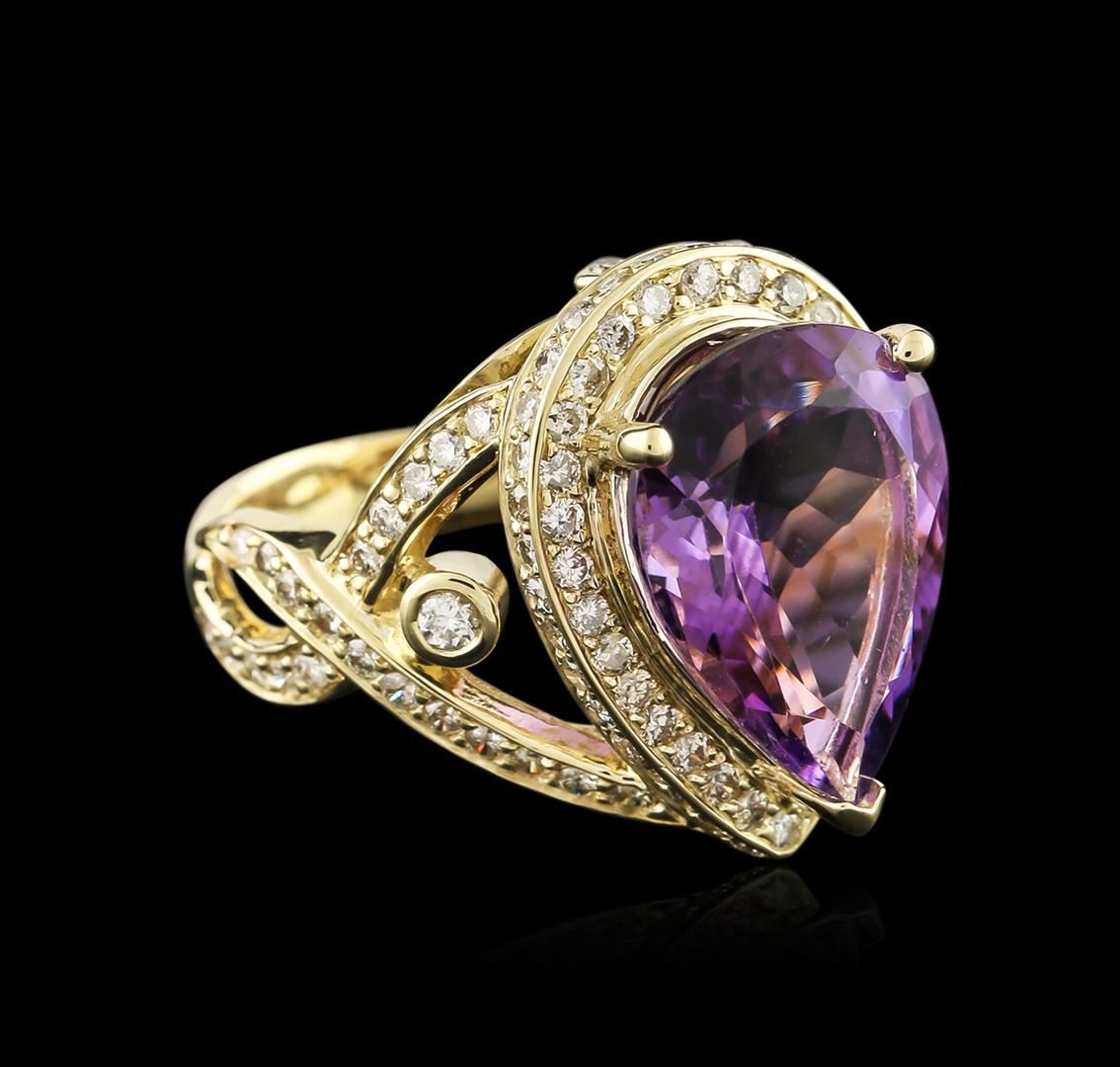 One electronically tested 14KT yellow gold ladies cast amethyst and diamond ring with a bright polish finish. Identified with markings of "14K". Condition is new. Containing: One prong set pear modified brilliant cut natural amethyst, measuring 15.41 x 11.93 x 7.43mm, approximate weight of 7.27ct., clarity is eye clean, type II, medium, moderately strong, purple color, (GIA P 5/4), cut is good. Two bezel set round brilliant cut diamonds, measuring 2.00 - 2.00 x 1.20mm (depth est.) approximate total weight of 2 Stones = 0.06ct. Clarity: SI-1. Color: I - J, Cut is Good. Ninety-Seven prong set round brilliant cut diamonds, measuring 1.30 - 1.30 x 0.78mm (depth est.) approximate total weight of 97 Stones = 0.78ct. Clarity: SI-2 to I-1. Color: I - J, Cut is Good. Diamonds and colored gemstones are graded in the mounting, unless otherwise stated. Colored gemstones are presumed to have been subjected to commonly used enhancement processes. Total Weight of Colored Stones 7.27ct. Total Weight of Diamonds 0.83ct. Total Weight of Ring 10.10 grams. GGL Appraised at $3,390.00.