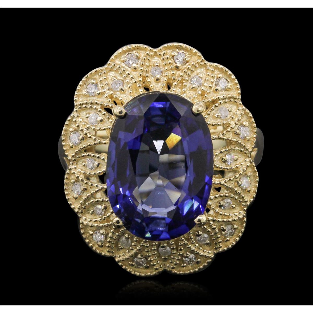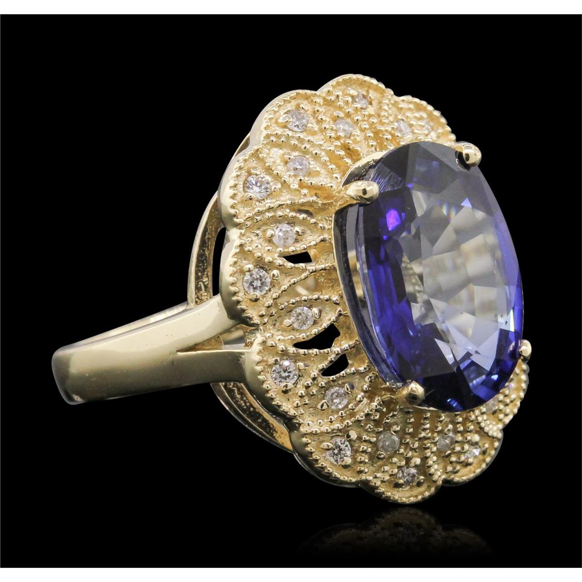 One electronically tested 14KT yellow gold Ladies combination cast & assembled ring with a high polish finish. Condition is new. Identified with markings of "K14". Containing: One prong set oval modified mixed cut natural tanzanite, measuring 13.00 x 10.00 x 6.50mm, approximate weight of 7.38ct., clarity is eye clean, type I, medium, moderately strong, bluish violet color, (GIA bV 5/4), cut is very good. Colored gemstones are presumed to have been subjected to commonly used color/clarity enhancement processes. Forty-Eight prong set round brilliant cut diamonds, measuring 1.50 - 1.20 x 0.81mm (depth est.) approximate. Total Weight of 48 Stones = 0.51ct. Clarity: I-1 to I-2. Color: I - J, Cut is Good. Total Weight of Colored Stones 7.38ct. Total Weight of Diamonds 0.51ct. Total Weight of Ring 10.10 grams. GGL Appraised at $9,560.00.
