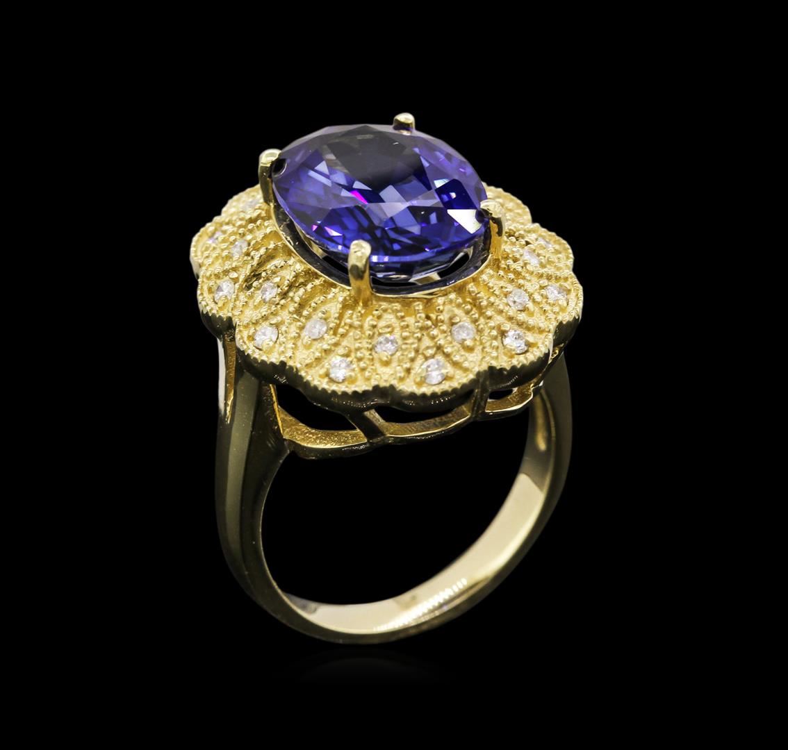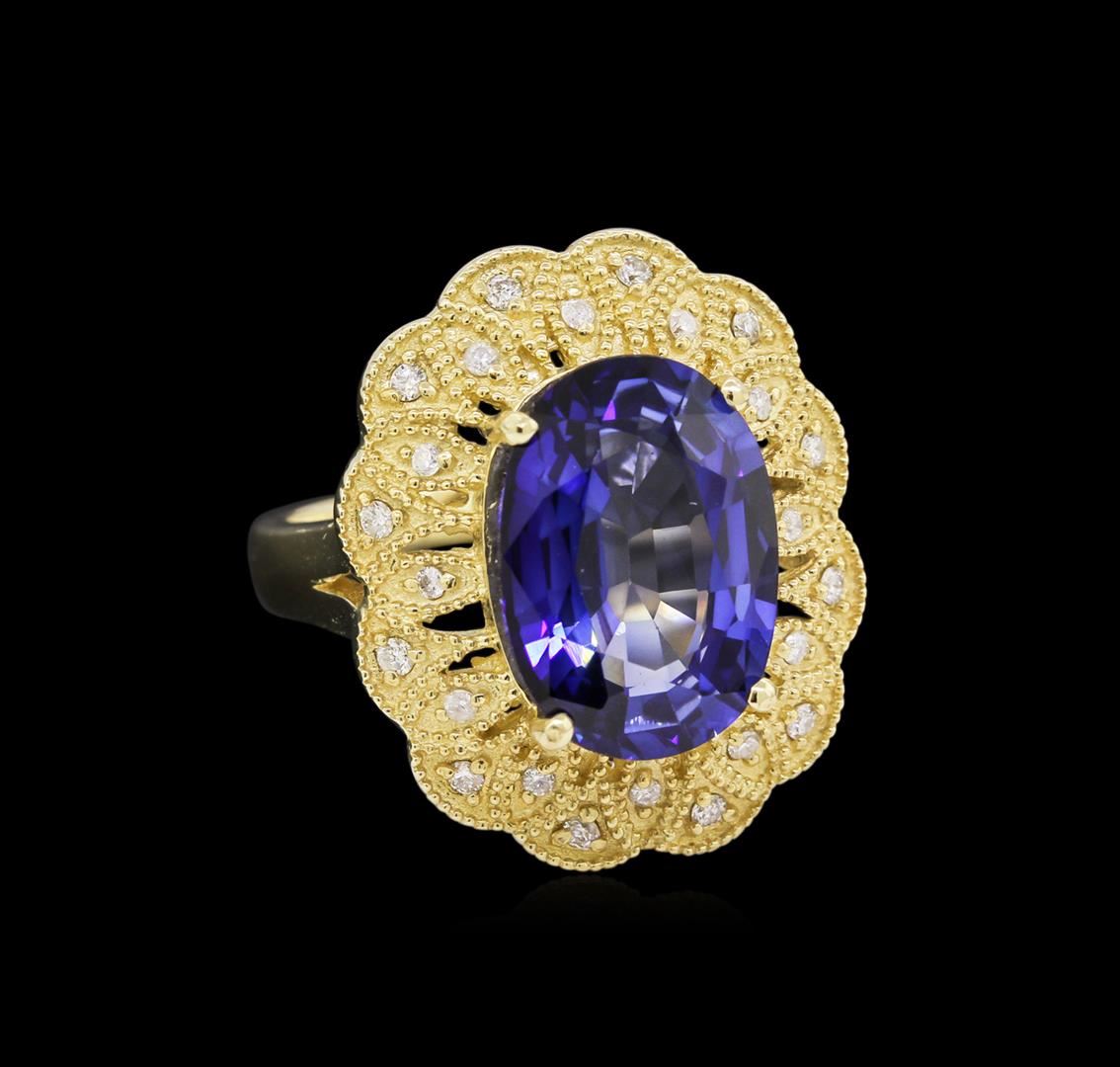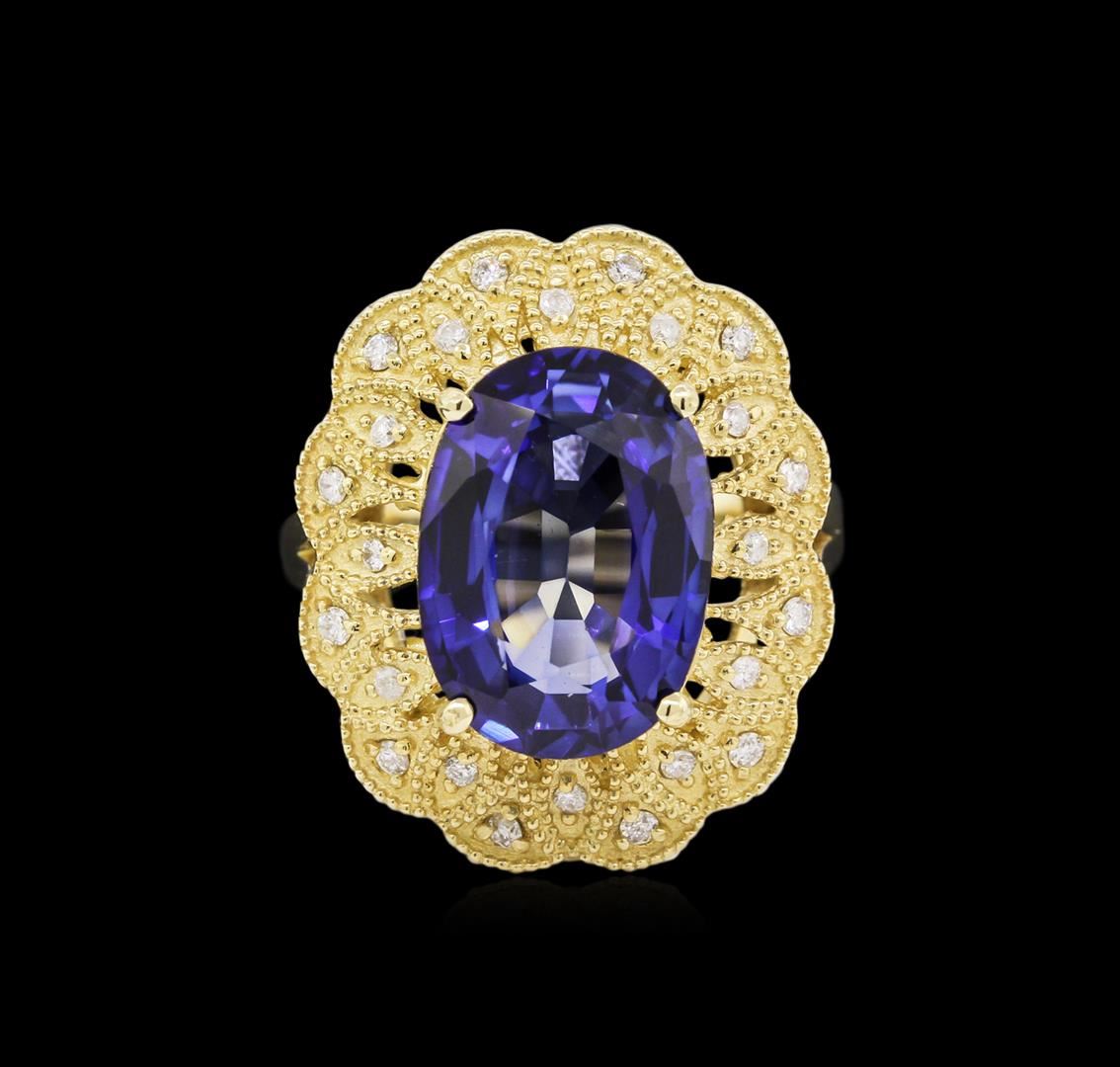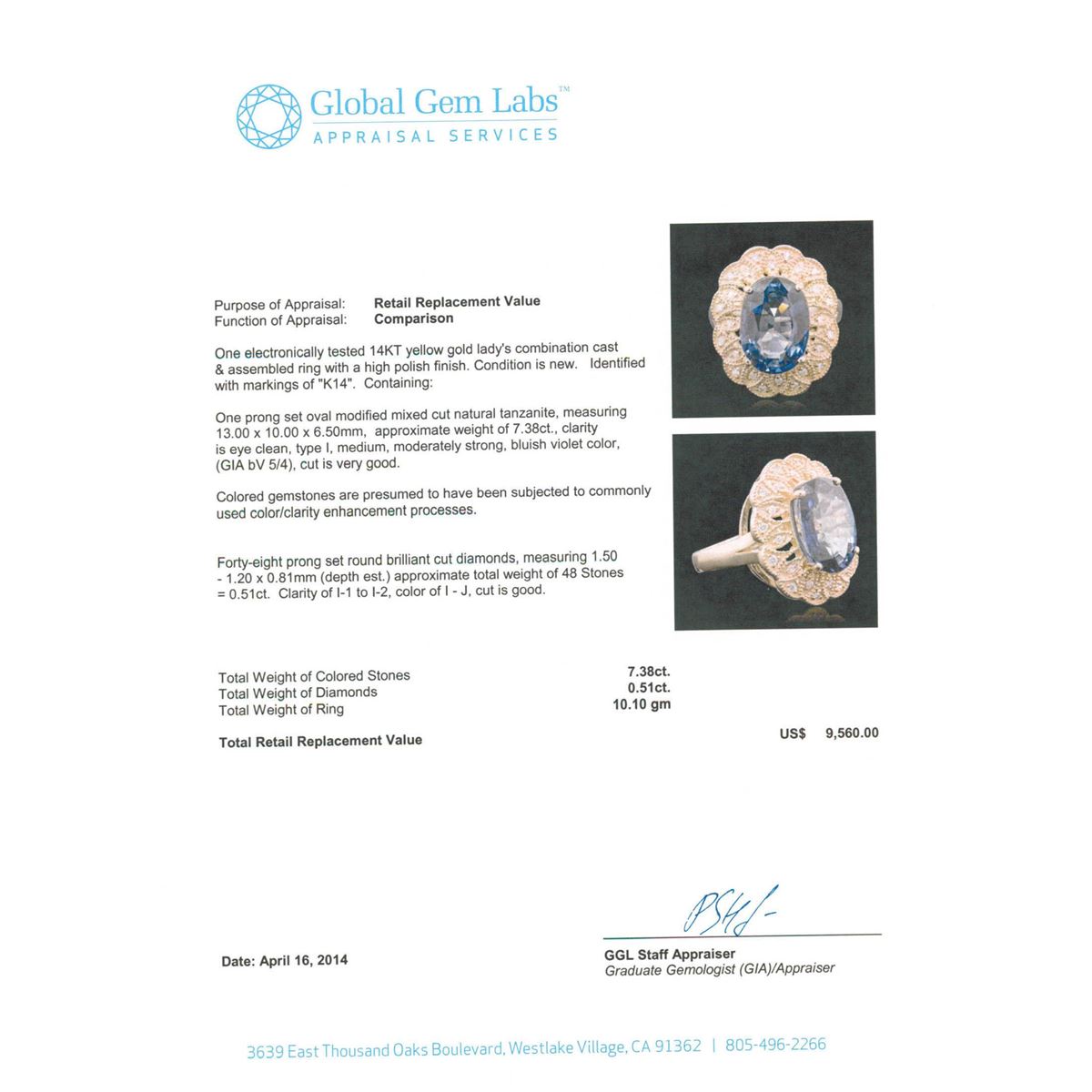 One electronically tested 14KT yellow gold Ladies combination cast & assembled ring with a high polish finish. Condition is new. Identified with markings of "K14". Containing: One prong set oval modified mixed cut natural tanzanite, measuring 13.00 x 10.00 x 6.50mm, approximate weight of 7.38ct., clarity is eye clean, type I, medium, moderately strong, bluish violet color, (GIA bV 5/4), cut is very good. Colored gemstones are presumed to have been subjected to commonly used color/clarity enhancement processes. Forty-Eight prong set round brilliant cut diamonds, measuring 1.50 - 1.20 x 0.81mm (depth est.) approximate. Total Weight of 48 Stones = 0.51ct. Clarity: I-1 to I-2. Color: I - J, Cut is Good. Total Weight of Colored Stones 7.38ct. Total Weight of Diamonds 0.51ct. Total Weight of Ring 10.10 grams. GGL Appraised at $9,560.00.