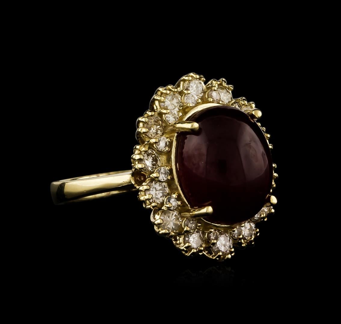 One electronically tested 14KT yellow gold ladies cast ruby and diamond ring with a bright polish finish. Identified with markings of "14K". Condition is new. Containing: One prong set oval cabochon cut natural ruby, measuring 12.50 x 10.00 x 5.64mm, approximate weight of 7.61ct., clarity is heavily included, type II, medium dark, moderately strong, strongly purplish red color, (GIA stpR 6/4), cut is good. Fourteen prong set round brilliant cut diamonds, measuring 2.50 - 2.50 x 1.50mm (depth est.) approximate total weight of 14 Stones = 0.80 ct. Clarity: SI-1 to SI-2. Color: J - K, Cut is Good. Fourteen prong set round brilliant cut diamonds, measuring 1.30 - 1.30 x 0.78mm (depth est.) approximate total weight of 14 Stones = 0.11ct. Clarity: SI-1 to SI-2. Color: J - K, Cut is Good. Colored gemstones are presumed to have been subjected to commonly used enhancement processes, All diamonds and colored gemstones are graded in the mounting, unless otherwise stated. Total Weight of Colored Stones 7.61ct. Total Weight of Diamonds 0.91ct. Total Weight of Ring 7.40 grams. GGL Appraised.