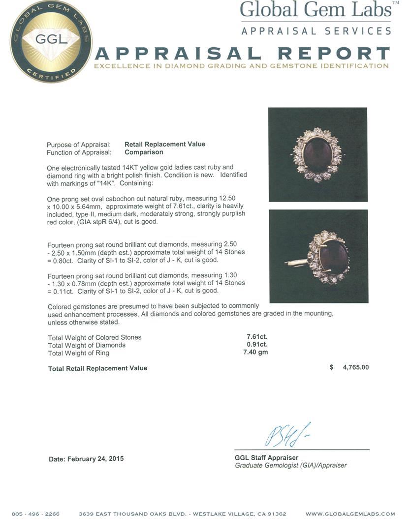 One electronically tested 14KT yellow gold ladies cast ruby and diamond ring with a bright polish finish. Identified with markings of "14K". Condition is new. Containing: One prong set oval cabochon cut natural ruby, measuring 12.50 x 10.00 x 5.64mm, approximate weight of 7.61ct., clarity is heavily included, type II, medium dark, moderately strong, strongly purplish red color, (GIA stpR 6/4), cut is good. Fourteen prong set round brilliant cut diamonds, measuring 2.50 - 2.50 x 1.50mm (depth est.) approximate total weight of 14 Stones = 0.80 ct. Clarity: SI-1 to SI-2. Color: J - K, Cut is Good. Fourteen prong set round brilliant cut diamonds, measuring 1.30 - 1.30 x 0.78mm (depth est.) approximate total weight of 14 Stones = 0.11ct. Clarity: SI-1 to SI-2. Color: J - K, Cut is Good. Colored gemstones are presumed to have been subjected to commonly used enhancement processes, All diamonds and colored gemstones are graded in the mounting, unless otherwise stated. Total Weight of Colored Stones 7.61ct. Total Weight of Diamonds 0.91ct. Total Weight of Ring 7.40 grams. GGL Appraised.