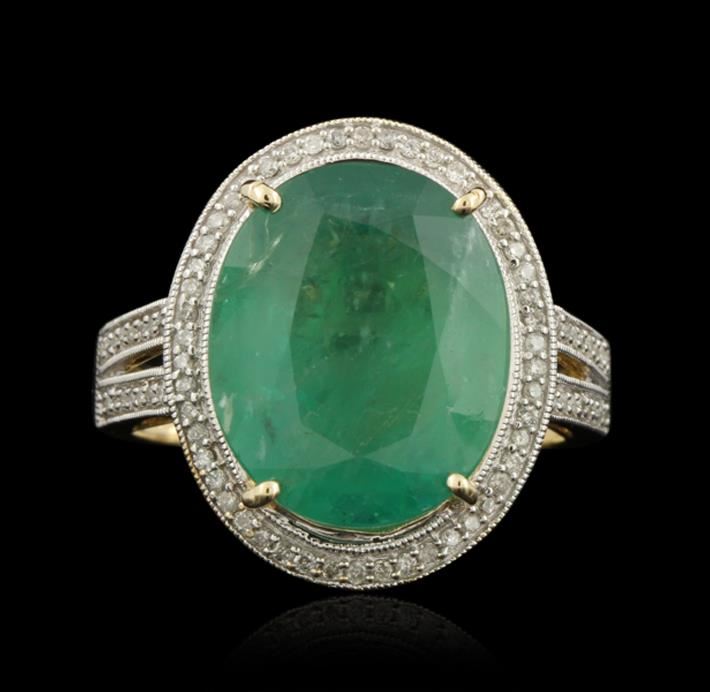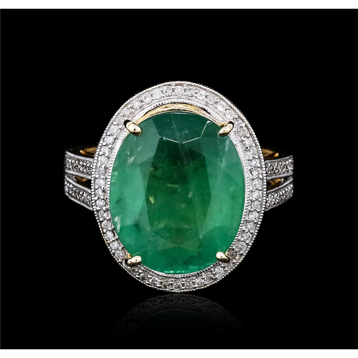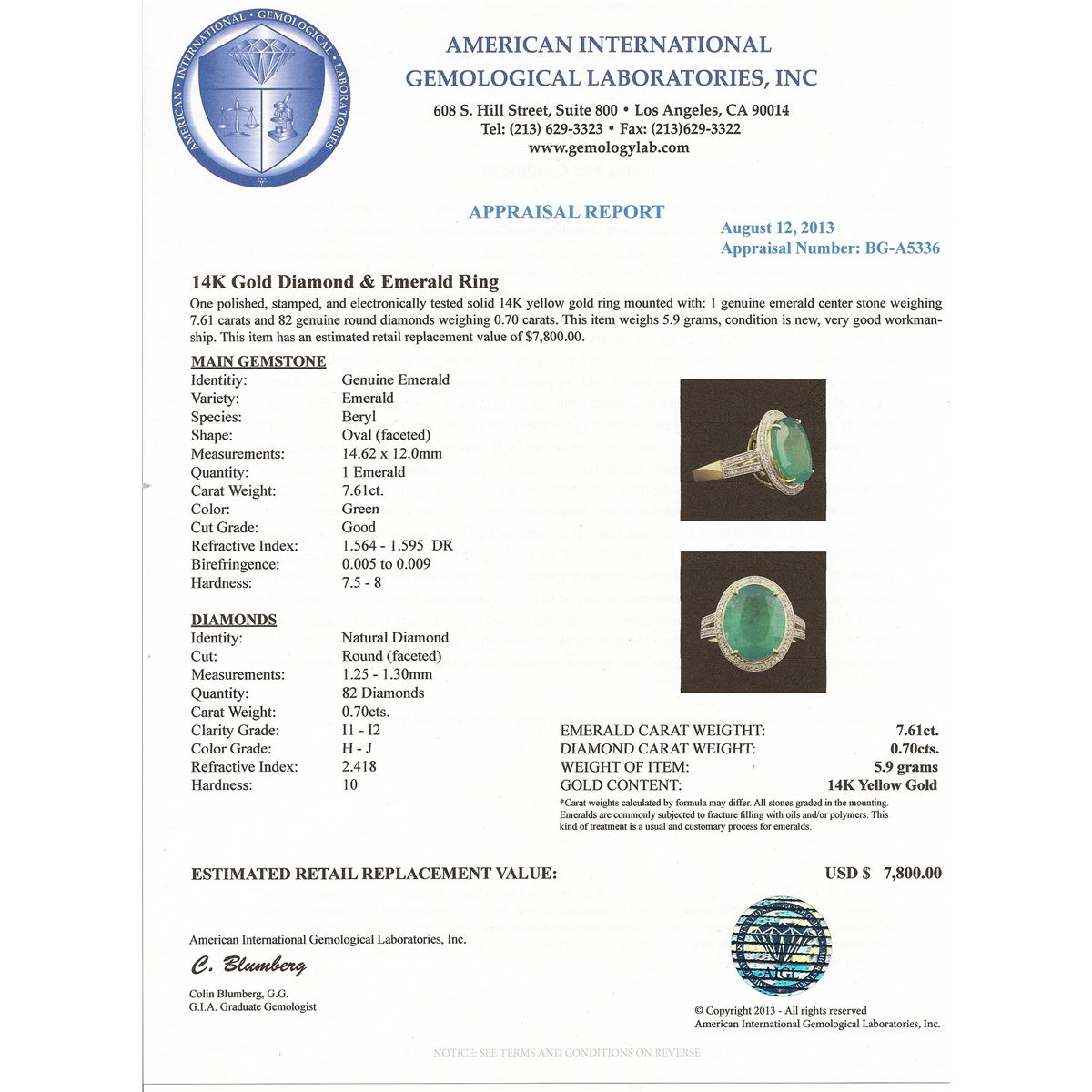 One polished, stamped, and electronically tested solid 14K yellow gold ring mounted with: 1 genuine emerald center stone weighing 7.61 carats and 82 genuine round diamonds weighing 0.70 carats. This item weighs 5.9 grams, condition is new, very good workmanship. AIGL Appraised at $7,800.00.