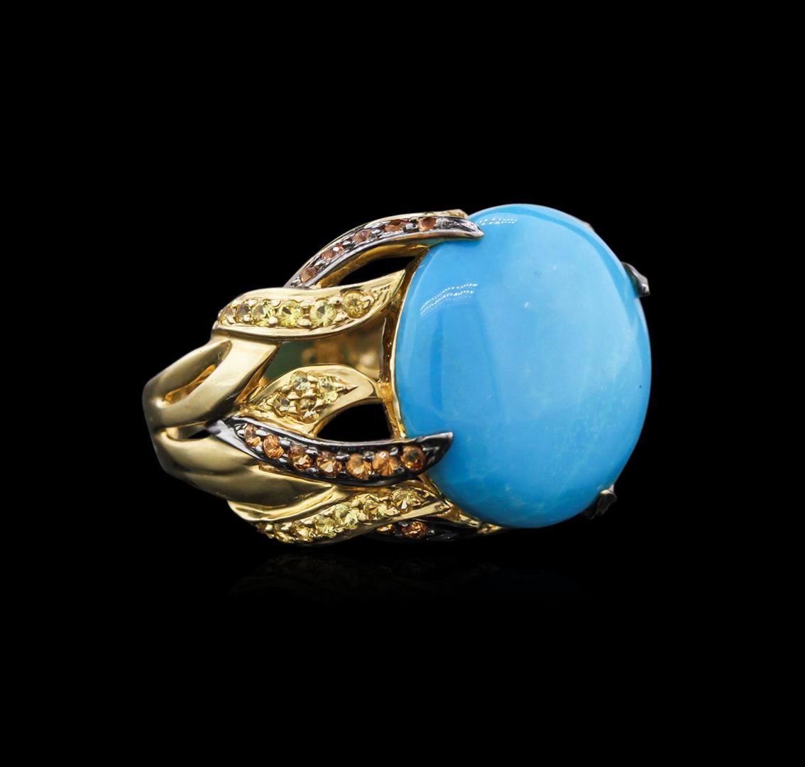 One ring featuring: 14KT yellow gold weighing 6.68 grams containing one turquoise center stone with a total weight of 7.64ct, 40 yellow sapphires with a total weight of 0.46ct and 28 orange sapphires with a total weight of 0.38ct.