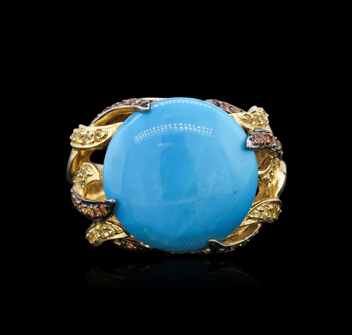 One ring featuring: 14KT yellow gold weighing 6.68 grams containing one turquoise center stone with a total weight of 7.64ct, 40 yellow sapphires with a total weight of 0.46ct and 28 orange sapphires with a total weight of 0.38ct.