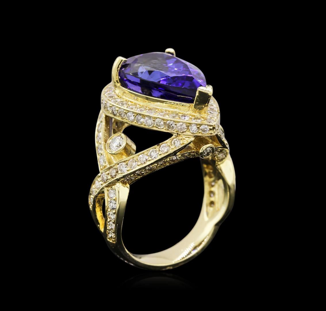 One electronically tested 14KT yellow gold ladies cast tanzanite and diamond ring with a bright polish finish. Condition is new, good workmanship. The featured tanzanite is set within a diamond bezel, supported by diamond set intertwined ribbons of diamonds as shoulders and completed by a four millimeter wide band. Identified with markings of "14K". Containing: One prong set pear modified brilliant cut natural tanzanite, measuring 15.79 x 9.73 x 7.74mm, exact weight 7.74ct., clarity is eye clean, type I, medium dark, moderately strong, violetish blue color, (GIA vB 6/4), cut is good. Transmitting light with no distortion, transparent. GIA Gemological Report attached. Graded loose prior to setting in the GIA Laboratory, Report #6157951680.Tanzanite is a very rare gemstone that is only found in the country of Tanzania. Originally discovered in 1967. Tiffany & Company, named the stone Tanzanite. It is found in the Usumburu Mountains that border the Umba Valley of northern Tanzania. Tanzanite occurs in gray, brown, violet, blue, reddish-purple, & green. The gem is interesting because of its exceptional pleochroism. Rotated in different directions a tanzanite will exhibit multiple changes of color. Tanzanite has a low tolerance to ultrasonic cleaning, and should not be cleaned using this method. One Hundred Thirty-Two bead & bezel set round brilliant cut diamonds, measuring 2.50 - 1.50 x 1.20mm (depth est.) approximate. Total Weight of 132 Stones = 1.84ct. Graded in the setting. Clarity: SI-1 to I-1. Color: G - I. Total Weight of Colored Stones 7.74ct. Total Weight of Diamonds 1.84ct. Total Weight of Ring 10.10 grams. AIG Appraised at $28,825.00.