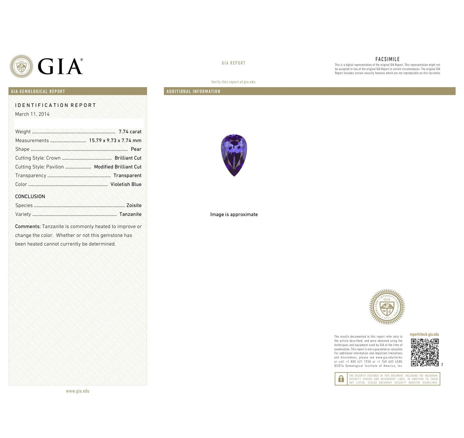 One electronically tested 14KT yellow gold ladies cast tanzanite and diamond ring with a bright polish finish. Condition is new, good workmanship. The featured tanzanite is set within a diamond bezel, supported by diamond set intertwined ribbons of diamonds as shoulders and completed by a four millimeter wide band. Identified with markings of "14K". Containing: One prong set pear modified brilliant cut natural tanzanite, measuring 15.79 x 9.73 x 7.74mm, exact weight 7.74ct., clarity is eye clean, type I, medium dark, moderately strong, violetish blue color, (GIA vB 6/4), cut is good. Transmitting light with no distortion, transparent. GIA Gemological Report attached. Graded loose prior to setting in the GIA Laboratory, Report #6157951680.Tanzanite is a very rare gemstone that is only found in the country of Tanzania. Originally discovered in 1967. Tiffany & Company, named the stone Tanzanite. It is found in the Usumburu Mountains that border the Umba Valley of northern Tanzania. Tanzanite occurs in gray, brown, violet, blue, reddish-purple, & green. The gem is interesting because of its exceptional pleochroism. Rotated in different directions a tanzanite will exhibit multiple changes of color. Tanzanite has a low tolerance to ultrasonic cleaning, and should not be cleaned using this method. One Hundred Thirty-Two bead & bezel set round brilliant cut diamonds, measuring 2.50 - 1.50 x 1.20mm (depth est.) approximate. Total Weight of 132 Stones = 1.84ct. Graded in the setting. Clarity: SI-1 to I-1. Color: G - I. Total Weight of Colored Stones 7.74ct. Total Weight of Diamonds 1.84ct. Total Weight of Ring 10.10 grams. AIG Appraised at $28,825.00.