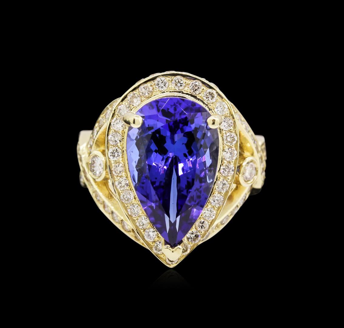 One electronically tested 14KT yellow gold ladies cast tanzanite and diamond ring with a bright polish finish. Condition is new, good workmanship. The featured tanzanite is set within a diamond bezel, supported by diamond set intertwined ribbons of diamonds as shoulders and completed by a four millimeter wide band. Identified with markings of "14K". Containing: One prong set pear modified brilliant cut natural tanzanite, measuring 15.79 x 9.73 x 7.74mm, exact weight 7.74ct., clarity is eye clean, type I, medium dark, moderately strong, violetish blue color, (GIA vB 6/4), cut is good. Transmitting light with no distortion, transparent. GIA Gemological Report attached. Graded loose prior to setting in the GIA Laboratory, Report #6157951680.Tanzanite is a very rare gemstone that is only found in the country of Tanzania. Originally discovered in 1967. Tiffany & Company, named the stone Tanzanite. It is found in the Usumburu Mountains that border the Umba Valley of northern Tanzania. Tanzanite occurs in gray, brown, violet, blue, reddish-purple, & green. The gem is interesting because of its exceptional pleochroism. Rotated in different directions a tanzanite will exhibit multiple changes of color. Tanzanite has a low tolerance to ultrasonic cleaning, and should not be cleaned using this method. One Hundred Thirty-Two bead & bezel set round brilliant cut diamonds, measuring 2.50 - 1.50 x 1.20mm (depth est.) approximate. Total Weight of 132 Stones = 1.84ct. Graded in the setting. Clarity: SI-1 to I-1. Color: G - I. Total Weight of Colored Stones 7.74ct. Total Weight of Diamonds 1.84ct. Total Weight of Ring 10.10 grams. AIG Appraised at $28,825.00.