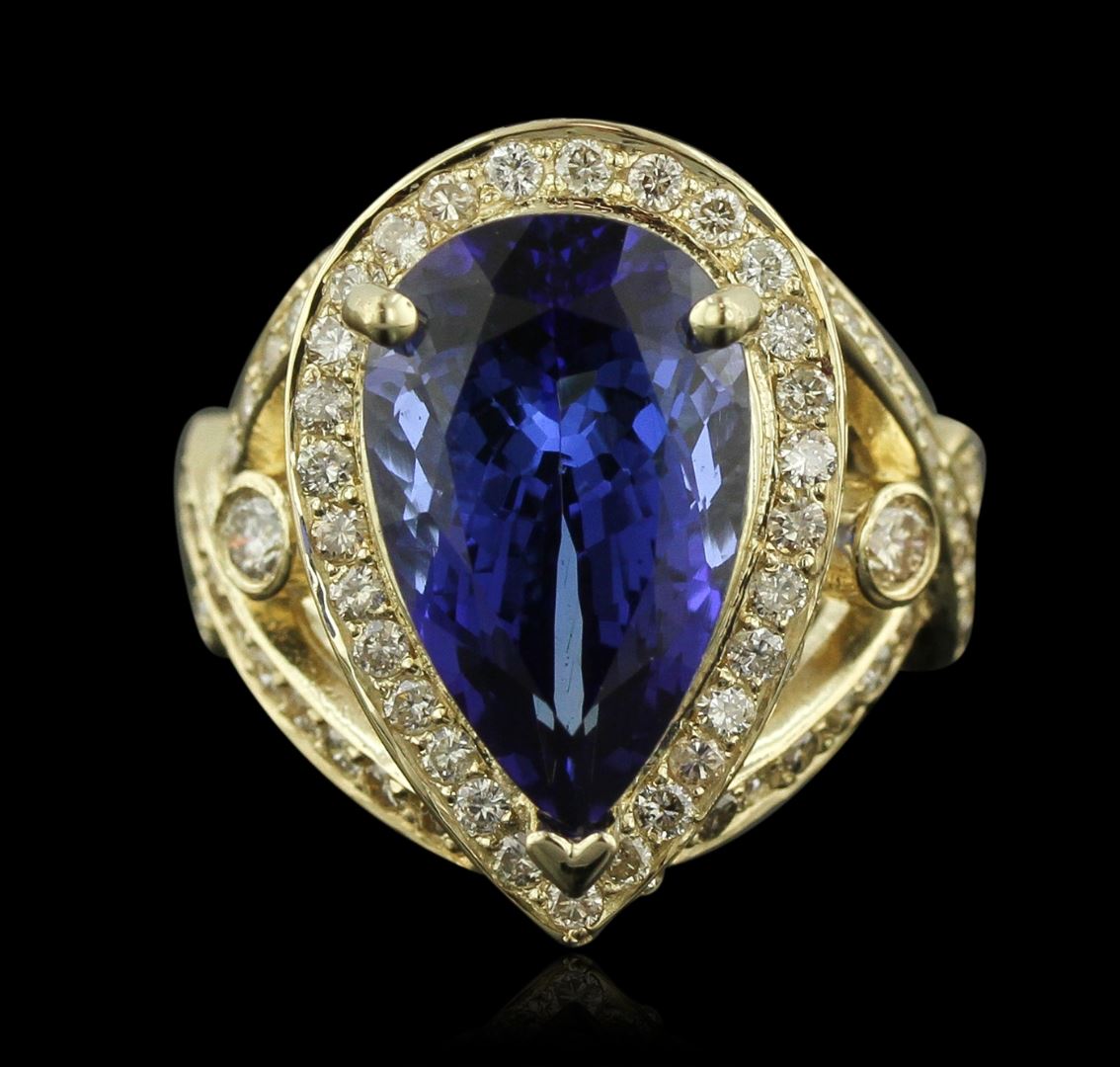 One electronically tested 14KT yellow gold ladies cast tanzanite and diamond ring with a bright polish finish. Condition is new, good workmanship. The featured tanzanite is set within a diamond bezel, supported by diamond set intertwined ribbons of diamonds as shoulders and completed by a four millimeter wide band. Identified with markings of "14K". Containing: One prong set pear modified brilliant cut natural tanzanite, measuring 15.79 x 9.73 x 7.74mm, exact weight 7.74ct., clarity is eye clean, type I, medium dark, moderately strong, violetish blue color, (GIA vB 6/4), cut is good. Transmitting light with no distortion, transparent. GIA Gemological Report attached. Graded loose prior to setting in the GIA Laboratory, Report #6157951680.Tanzanite is a very rare gemstone that is only found in the country of Tanzania. Originally discovered in 1967. Tiffany & Company, named the stone Tanzanite. It is found in the Usumburu Mountains that border the Umba Valley of northern Tanzania. Tanzanite occurs in gray, brown, violet, blue, reddish-purple, & green. The gem is interesting because of its exceptional pleochroism. Rotated in different directions a tanzanite will exhibit multiple changes of color. Tanzanite has a low tolerance to ultrasonic cleaning, and should not be cleaned using this method. One Hundred Thirty-Two bead & bezel set round brilliant cut diamonds, measuring 2.50 - 1.50 x 1.20mm (depth est.) approximate. Total Weight of 132 Stones = 1.84ct. Graded in the setting. Clarity: SI-1 to I-1. Color: G - I. Total Weight of Colored Stones 7.74ct. Total Weight of Diamonds 1.84ct. Total Weight of Ring 10.10 grams. AIG Appraised at $28,825.00.
