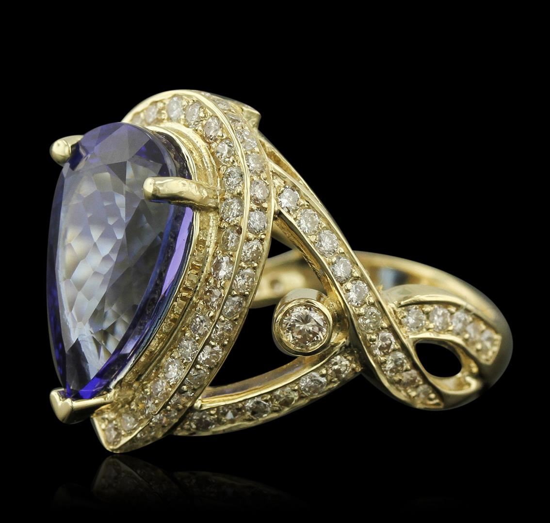 One electronically tested 14KT yellow gold ladies cast tanzanite and diamond ring with a bright polish finish. Condition is new, good workmanship. The featured tanzanite is set within a diamond bezel, supported by diamond set intertwined ribbons of diamonds as shoulders and completed by a four millimeter wide band. Identified with markings of "14K". Containing: One prong set pear modified brilliant cut natural tanzanite, measuring 15.79 x 9.73 x 7.74mm, exact weight 7.74ct., clarity is eye clean, type I, medium dark, moderately strong, violetish blue color, (GIA vB 6/4), cut is good. Transmitting light with no distortion, transparent. GIA Gemological Report attached. Graded loose prior to setting in the GIA Laboratory, Report #6157951680.Tanzanite is a very rare gemstone that is only found in the country of Tanzania. Originally discovered in 1967. Tiffany & Company, named the stone Tanzanite. It is found in the Usumburu Mountains that border the Umba Valley of northern Tanzania. Tanzanite occurs in gray, brown, violet, blue, reddish-purple, & green. The gem is interesting because of its exceptional pleochroism. Rotated in different directions a tanzanite will exhibit multiple changes of color. Tanzanite has a low tolerance to ultrasonic cleaning, and should not be cleaned using this method. One Hundred Thirty-Two bead & bezel set round brilliant cut diamonds, measuring 2.50 - 1.50 x 1.20mm (depth est.) approximate. Total Weight of 132 Stones = 1.84ct. Graded in the setting. Clarity: SI-1 to I-1. Color: G - I. Total Weight of Colored Stones 7.74ct. Total Weight of Diamonds 1.84ct. Total Weight of Ring 10.10 grams. AIG Appraised at $28,825.00.
