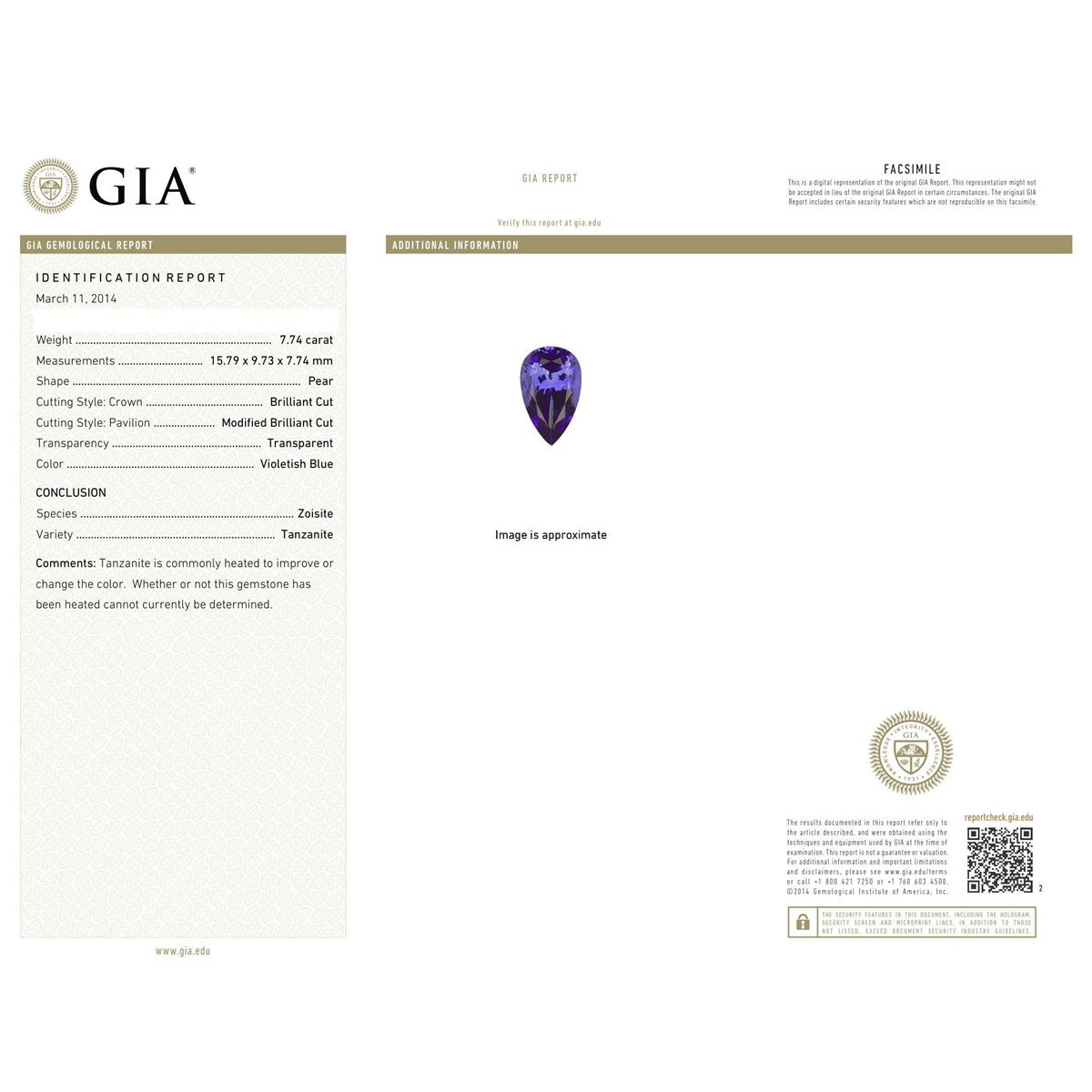 One electronically tested 14KT yellow gold ladies cast tanzanite and diamond ring with a bright polish finish. Condition is new, good workmanship. The featured tanzanite is set within a diamond bezel, supported by diamond set intertwined ribbons of diamonds as shoulders and completed by a four millimeter wide band. Identified with markings of "14K". Containing: One prong set pear modified brilliant cut natural tanzanite, measuring 15.79 x 9.73 x 7.74mm, exact weight 7.74ct., clarity is eye clean, type I, medium dark, moderately strong, violetish blue color, (GIA vB 6/4), cut is good. Transmitting light with no distortion, transparent. GIA Gemological Report attached. Graded loose prior to setting in the GIA Laboratory, Report #6157951680.Tanzanite is a very rare gemstone that is only found in the country of Tanzania. Originally discovered in 1967. Tiffany & Company, named the stone Tanzanite. It is found in the Usumburu Mountains that border the Umba Valley of northern Tanzania. Tanzanite occurs in gray, brown, violet, blue, reddish-purple, & green. The gem is interesting because of its exceptional pleochroism. Rotated in different directions a tanzanite will exhibit multiple changes of color. Tanzanite has a low tolerance to ultrasonic cleaning, and should not be cleaned using this method. One Hundred Thirty-Two bead & bezel set round brilliant cut diamonds, measuring 2.50 - 1.50 x 1.20mm (depth est.) approximate. Total Weight of 132 Stones = 1.84ct. Graded in the setting. Clarity: SI-1 to I-1. Color: G - I. Total Weight of Colored Stones 7.74ct. Total Weight of Diamonds 1.84ct. Total Weight of Ring 10.10 grams. AIG Appraised at $28,825.00.