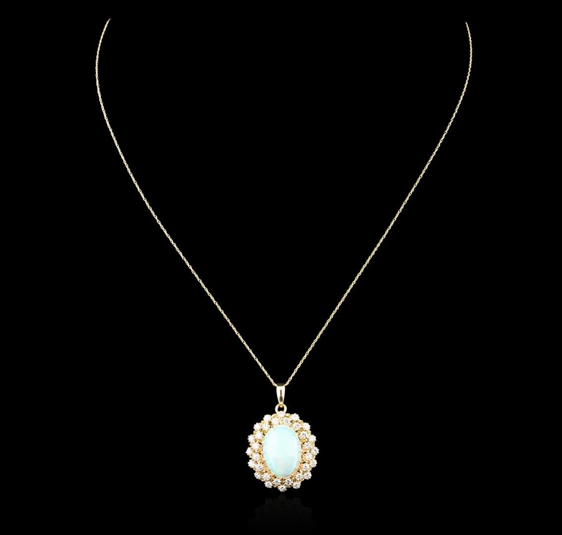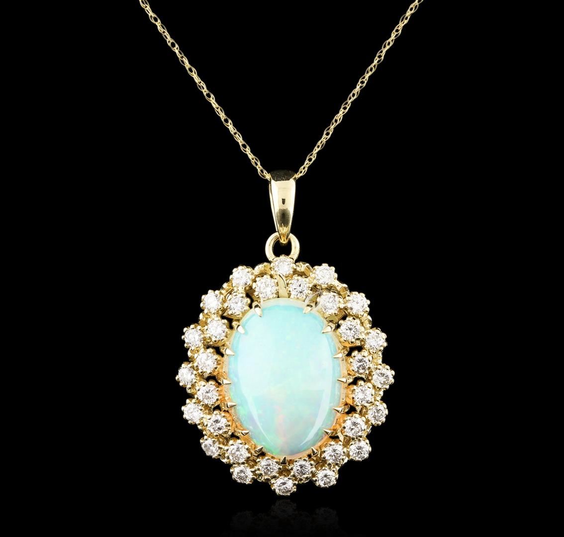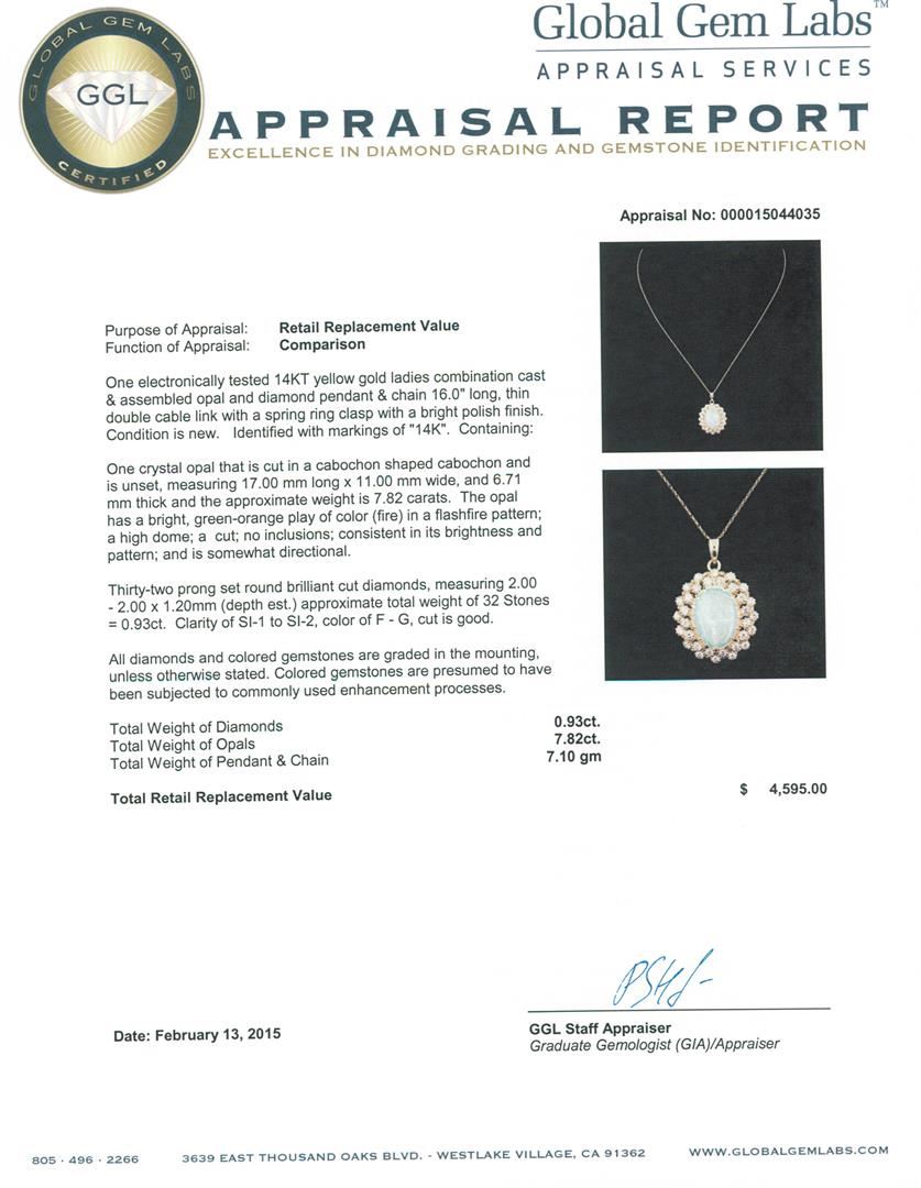 One electronically tested 14KT yellow gold ladies combination cast & assembled opal and diamond pendant & chain 16.0" long, thin double cable link with a spring ring clasp with a bright polish finish. Identified with markings of "14K". Condition is new. Containing: One crystal opal that is cut in a cabochon shaped cabochon and is unset, measuring 17.00 mm long x 11.00 mm wide, and 6.71 mm thick and the approximate weight is 7.82 carats. The opal has a bright, green-orange play of color (fire) in a flashfire pattern; a high dome; a cut; no inclusions; consistent in its brightness and pattern; and is somewhat directional. Thirty-Two prong set round brilliant cut diamonds, measuring 2.00 - 2.00 x 1.20mm (depth est.) approximate total weight of 32 Stones = 0.93ct. Clarity: SI-1 to SI-2. Color: F - G, Cut is Good. All diamonds and colored gemstones are graded in the mounting, unless otherwise stated. Colored gemstones are presumed to have been subjected to commonly used enhancement processes. Total Weight of Diamonds 0.93ct. Total Weight of Opals 7.82ct. Total Weight of Pendant & Chain 7.10 grams. GGL Appraised at $4,595.00.