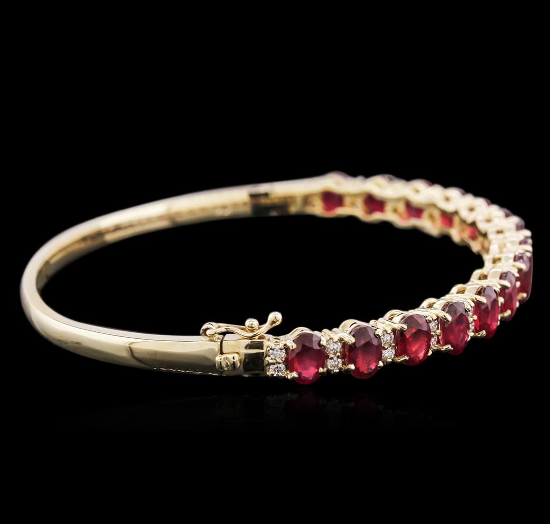 One electronically tested 14KT yellow gold ladies cast ruby and diamond bangle bracelet with a hidden box clasp with safety closer with a bright polish finish. Condition is new. Containing: Fifteen prong set oval modified brilliant cut natural rubies, measuring 6.00 x 4.00 x 2.60mm, approximate total weight of 7.95ct., clarity is heavily included, medium, moderately strong, purple red color, (GIA PR 5/4), cut is good. Thirty-Two prong set round brilliant cut diamonds, measuring 1.30 - 1.30 x 0.78mm (depth est.) approximate total weight of 32 Stones = 0.26ct. Clarity: SI-2 to I-1. Color: J - K, Cut is Good. Colored gemstones are presumed to have been subjected to commonly used enhancement processes. All colored gemstones are graded in the mounting, unless otherwise stated. Total Weight of Colored Stones 7.95ct. Total Weight of Diamonds 0.26ct. Total Weight of Bangle Bracelet 19.30 grams. GGL Appraised at $4,510.00.