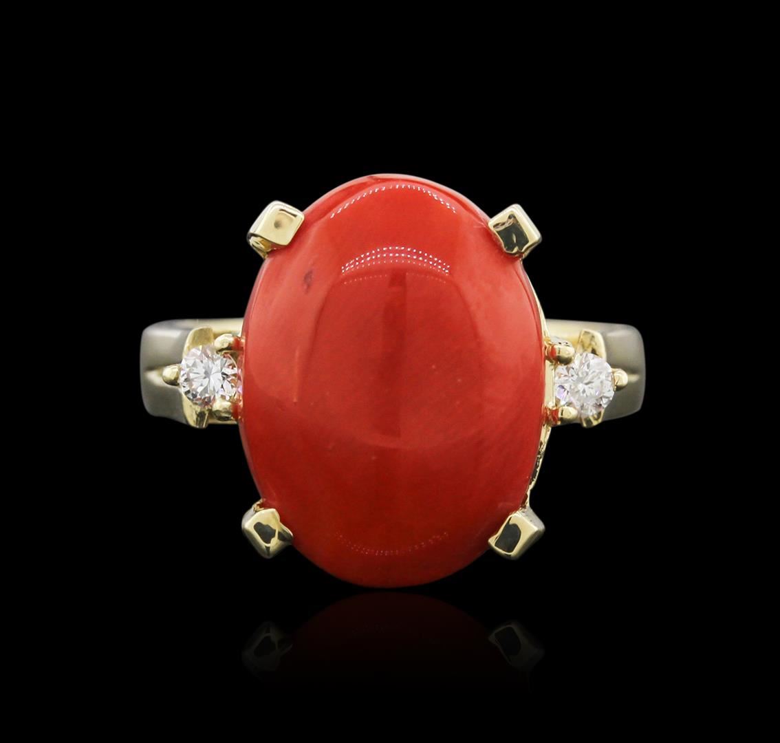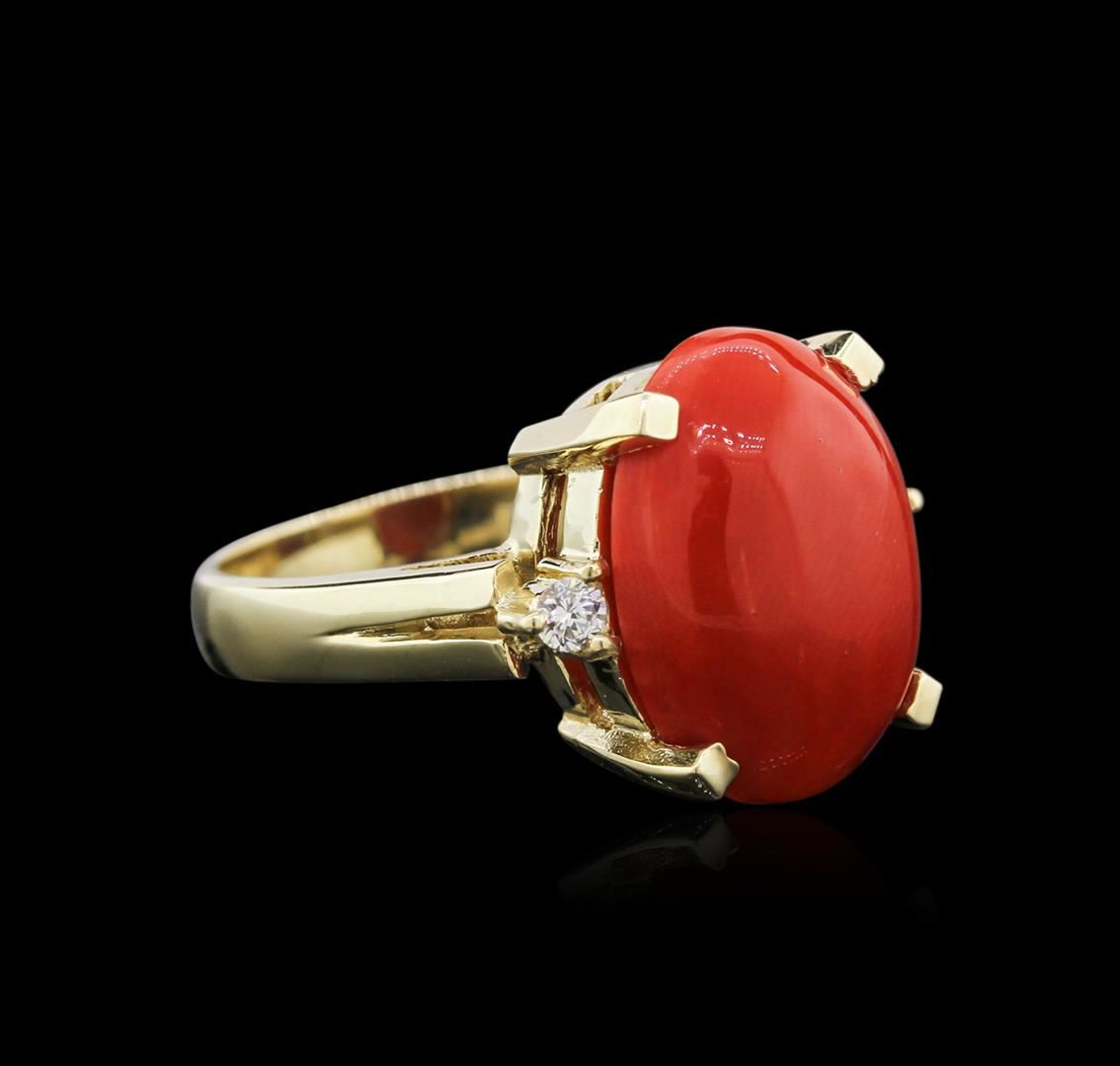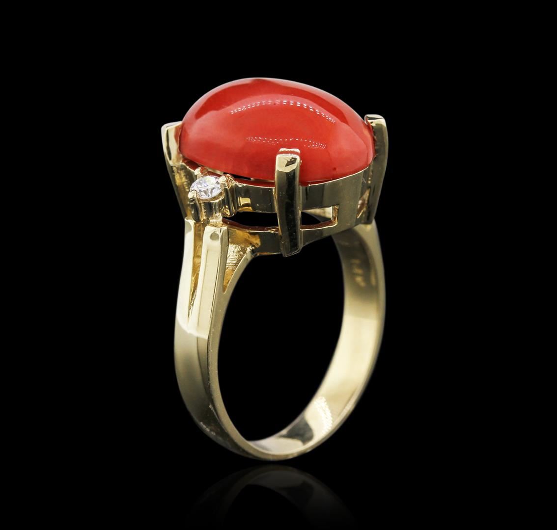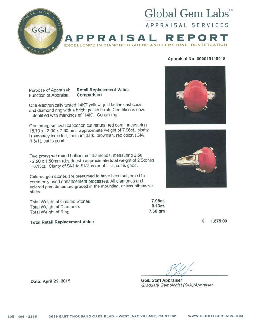 One electronically tested 14KT yellow gold ladies cast coral and diamond ring with a bright polish finish. Identified with markings of "14K". Condition is new. Containing: One prong set oval cabochon cut natural red coral, measuring 15.70 x 12.00 x 7.80mm, approximate weight of 7.96ct., clarity is severely included, medium dark, brownish, red color, (GIA R 6/1), cut is good. Two prong set round brilliant cut diamonds, measuring 2.50 - 2.50 x 1.50mm (depth est.) approximate total weight of 2 Stones = 0.13ct. Clarity: SI-1 to SI-2. Color: I - J, Cut is Good. Colored gemstones are presumed to have been subjected to commonly used enhancement processes. All diamonds and colored gemstones are graded in the mounting, unless otherwise stated. Total Weight of Colored Stones 7.96ct. Total Weight of Diamonds 0.13ct. Total Weight of Ring 7.30 grams. GGL Appraised at $1,875.00.