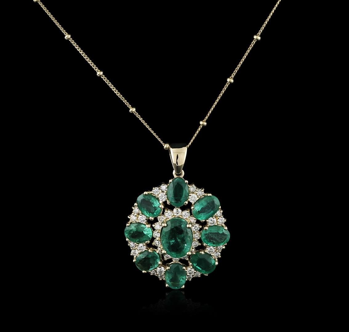 One electronically tested 14KT yellow gold ladies cast emerald and diamond pendant & chain 18.0" long, with a spring ring clasp with a bright polish finish. Identified with markings of "14K". Condition is new. Containing: One prong set oval modified brilliant cut natural emerald, measuring 9.80 x 7.50 x 4.88mm, approximate weight of 2.05ct., clarity is moderately included, type III, medium light, very slightly grayish, bluish green color, (GIA bG 4/3), cut is good. Eight prong set oval modified brilliant cut natural emeralds, measuring 7.50 x 5.50 x 3.58mm, approximate total weight of 5.92ct., clarity is moderately included, type III, medium light, very slightly grayish, bluish green color, (GIA bG 4/3), cut is good. Forty prong set round brilliant cut diamonds, measuring 2.00 - 1.50 x 1.05mm (depth est.) approximate total weight of 40 Stones = 0.93ct. Clarity: SI-1 to SI-2. Color: I - J, Cut is Good. Colored gemstones are presumed to have been subjected to commonly used enhancement processes. All diamonds and colored gemstones are graded in the mounting, unless otherwise stated. Total Weight of Colored Stones 7.97ct. Total Weight of Diamonds 0.93ct. Total Weight of Pendant & Chain 8.30 grams. GGL Appraised at $5,875.00.