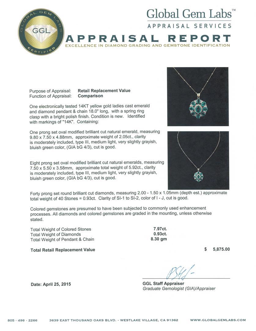 One electronically tested 14KT yellow gold ladies cast emerald and diamond pendant & chain 18.0" long, with a spring ring clasp with a bright polish finish. Identified with markings of "14K". Condition is new. Containing: One prong set oval modified brilliant cut natural emerald, measuring 9.80 x 7.50 x 4.88mm, approximate weight of 2.05ct., clarity is moderately included, type III, medium light, very slightly grayish, bluish green color, (GIA bG 4/3), cut is good. Eight prong set oval modified brilliant cut natural emeralds, measuring 7.50 x 5.50 x 3.58mm, approximate total weight of 5.92ct., clarity is moderately included, type III, medium light, very slightly grayish, bluish green color, (GIA bG 4/3), cut is good. Forty prong set round brilliant cut diamonds, measuring 2.00 - 1.50 x 1.05mm (depth est.) approximate total weight of 40 Stones = 0.93ct. Clarity: SI-1 to SI-2. Color: I - J, Cut is Good. Colored gemstones are presumed to have been subjected to commonly used enhancement processes. All diamonds and colored gemstones are graded in the mounting, unless otherwise stated. Total Weight of Colored Stones 7.97ct. Total Weight of Diamonds 0.93ct. Total Weight of Pendant & Chain 8.30 grams. GGL Appraised at $5,875.00.
