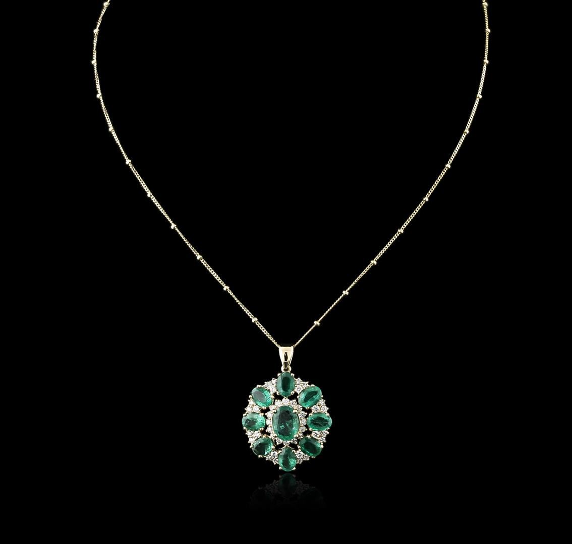 One electronically tested 14KT yellow gold ladies cast emerald and diamond pendant & chain 18.0" long, with a spring ring clasp with a bright polish finish. Identified with markings of "14K". Condition is new. Containing: One prong set oval modified brilliant cut natural emerald, measuring 9.80 x 7.50 x 4.88mm, approximate weight of 2.05ct., clarity is moderately included, type III, medium light, very slightly grayish, bluish green color, (GIA bG 4/3), cut is good. Eight prong set oval modified brilliant cut natural emeralds, measuring 7.50 x 5.50 x 3.58mm, approximate total weight of 5.92ct., clarity is moderately included, type III, medium light, very slightly grayish, bluish green color, (GIA bG 4/3), cut is good. Forty prong set round brilliant cut diamonds, measuring 2.00 - 1.50 x 1.05mm (depth est.) approximate total weight of 40 Stones = 0.93ct. Clarity: SI-1 to SI-2. Color: I - J, Cut is Good. Colored gemstones are presumed to have been subjected to commonly used enhancement processes. All diamonds and colored gemstones are graded in the mounting, unless otherwise stated. Total Weight of Colored Stones 7.97ct. Total Weight of Diamonds 0.93ct. Total Weight of Pendant & Chain 8.30 grams. GGL Appraised at $5,875.00.