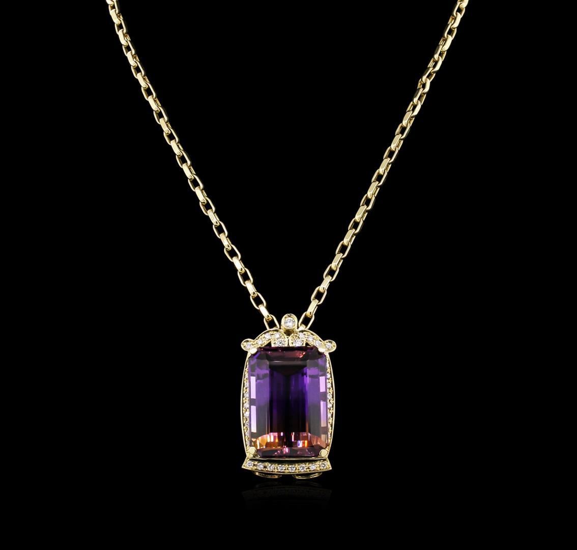 One electronically tested 14KT yellow gold ladies cast & assembled ametrine and diamond pendant with chain. Condition is new, good workmanship. The pendant features an ametrine set within a diamond set frame, completed by a concealed bail. The pendant is supported by an eighteen inch 14KT yellow gold designer style chain, terminating in a lobster claw clasp. Bright polish finish with milgrain detailing. Identified with markings of "14K". Containing: One prong set emerald step cut natural ametrine quartz, measuring 32.00 x 22.00 x 14.20mm, approximate weight of 73.39ct., clarity is eye clean, type I, medium dark, moderately strong, purple color, (GIA P 6/4) to medium, moderately strong, yellowish orange, (GIA y0 5/4), cut is good. Transmitting light with no distortion, transparent. Colored Stone Grading Report attached. Graded in the setting. Ametrine is one of the rarest gemstones in the world. It is actually two gems in one. Ametrine brings together the gold of Citrine and the purple of Amethyst. The unusual color variation found in Ametrine is due to the presence of iron that has oxidized at different states within the same crystal structure. This is a natural process. The world's only known source of Ametrine is the Anahi Mine in Bolivia. The Anahi mine began organized production in the early 1600's by the Spanish Conquistadors. The mine is named after the wife of the first owner, an Ayoreos Tribal Princess named Anahi. The native people of the Ayoreos Tribe inhabit the central plains of South America. Ametrine became popular in the United States about 1980 when material from the Anahi mine in Bolivia began to appear on the market in large quantities. Before 1980 Ametrine was quite unusual and was known as Amethyst-Citrine Quartz, or Golden Amethyst. Ametrine is usually highlighted by cutting the gem into rectangular shapes. Thirty-seven bead & bezel set round brilliant cut diamonds, measuring 3.50 - 2.00 x 1.65mm (depth est.) approximate total weight of 37 Stones = 1.32ct. Graded in the setting. Clarity SI-1 to I-1. Color G -- I. Total Weight of Colored Stones 73.39ct. Total Weight of Diamonds 1.32ct. Total Weight of Pendant With Chain 40.20gm. AIG Appraised.
