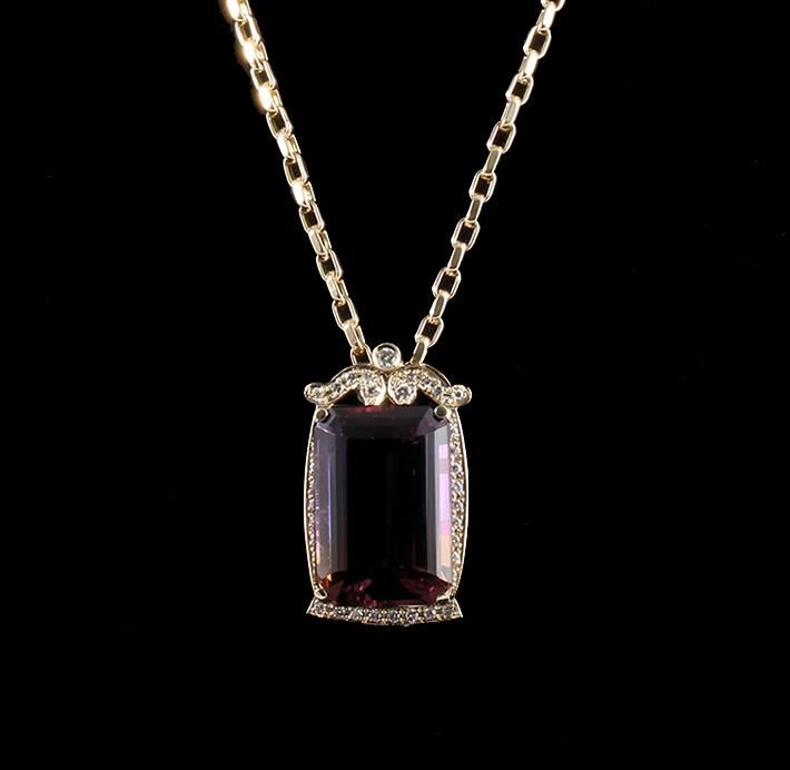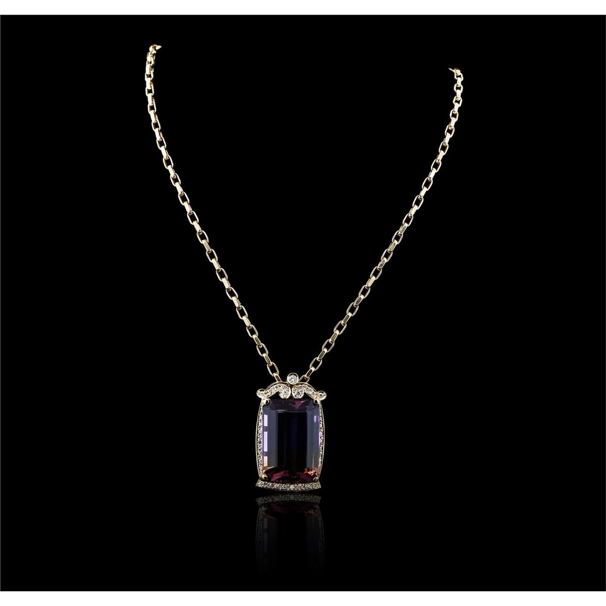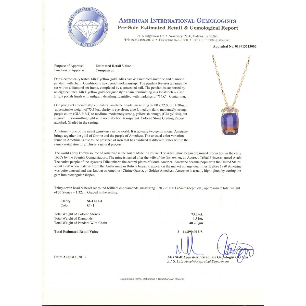 One electronically tested 14KT yellow gold ladies cast & assembled ametrine and diamond pendant with chain. Condition is new, good workmanship. The pendant features an ametrine set within a diamond set frame, completed by a concealed bail. The pendant is supported by an eighteen inch 14KT yellow gold designer style chain, terminating in a lobster claw clasp. Bright polish finish with milgrain detailing. Identified with markings of "14K". Containing: One prong set emerald step cut natural ametrine quartz, measuring 32.00 x 22.00 x 14.20mm, approximate weight of 73.39ct., clarity is eye clean, type I, medium dark, moderately strong, purple color, (GIA P 6/4) to medium, moderately strong, yellowish orange, (GIA y0 5/4), cut is good. Transmitting light with no distortion, transparent. Colored Stone Grading Report attached. Graded in the setting. Ametrine is one of the rarest gemstones in the world. It is actually two gems in one. Ametrine brings together the gold of Citrine and the purple of Amethyst. The unusual color variation found in Ametrine is due to the presence of iron that has oxidized at different states within the same crystal structure. This is a natural process. The world's only known source of Ametrine is the Anahi Mine in Bolivia. The Anahi mine began organized production in the early 1600's by the Spanish Conquistadors. The mine is named after the wife of the first owner, an Ayoreos Tribal Princess named Anahi. The native people of the Ayoreos Tribe inhabit the central plains of South America. Ametrine became popular in the United States about 1980 when material from the Anahi mine in Bolivia began to appear on the market in large quantities. Before 1980 Ametrine was quite unusual and was known as Amethyst-Citrine Quartz, or Golden Amethyst. Ametrine is usually highlighted by cutting the gem into rectangular shapes. Thirty-seven bead & bezel set round brilliant cut diamonds, measuring 3.50 - 2.00 x 1.65mm (depth est.) approximate total weight of 37 Stones = 1.32ct. Graded in the setting. Clarity SI-1 to I-1. Color G - I. Total Weight of Colored Stones 73.39ct. Total Weight of Diamonds 1.32ct. Total Weight of Pendant With Chain 40.20gm. AIG Appraised at $14,890.00.