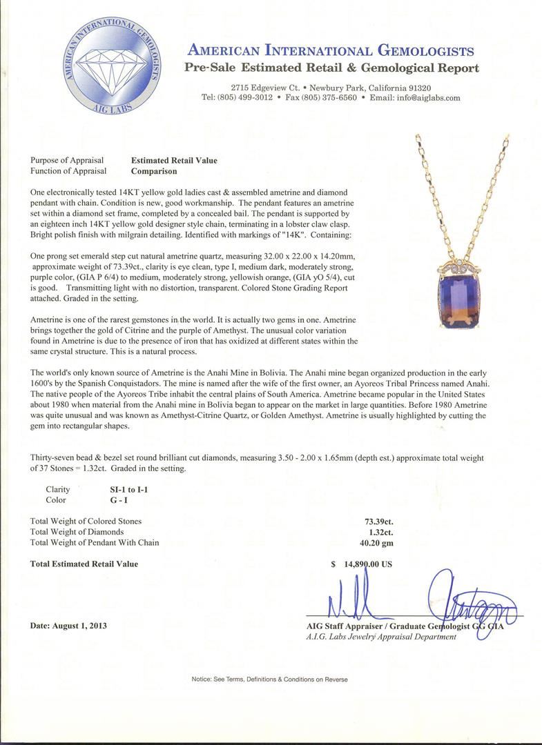 One electronically tested 14KT yellow gold ladies cast & assembled ametrine and diamond pendant with chain. Condition is new, good workmanship. The pendant features an ametrine set within a diamond set frame, completed by a concealed bail. The pendant is supported by an eighteen inch 14KT yellow gold designer style chain, terminating in a lobster claw clasp. Bright polish finish with milgrain detailing. Identified with markings of "14K". Containing: One prong set emerald step cut natural ametrine quartz, measuring 32.00 x 22.00 x 14.20mm, approximate weight of 73.39ct., clarity is eye clean, type I, medium dark, moderately strong, purple color, (GIA P 6/4) to medium, moderately strong, yellowish orange, (GIA y0 5/4), cut is good. Transmitting light with no distortion, transparent. Colored Stone Grading Report attached. Graded in the setting. Ametrine is one of the rarest gemstones in the world. It is actually two gems in one. Ametrine brings together the gold of Citrine and the purple of Amethyst. The unusual color variation found in Ametrine is due to the presence of iron that has oxidized at different states within the same crystal structure. This is a natural process. The world's only known source of Ametrine is the Anahi Mine in Bolivia. The Anahi mine began organized production in the early 1600's by the Spanish Conquistadors. The mine is named after the wife of the first owner, an Ayoreos Tribal Princess named Anahi. The native people of the Ayoreos Tribe inhabit the central plains of South America. Ametrine became popular in the United States about 1980 when material from the Anahi mine in Bolivia began to appear on the market in large quantities. Before 1980 Ametrine was quite unusual and was known as Amethyst-Citrine Quartz, or Golden Amethyst. Ametrine is usually highlighted by cutting the gem into rectangular shapes. Thirty-seven bead & bezel set round brilliant cut diamonds, measuring 3.50 - 2.00 x 1.65mm (depth est.) approximate total weight of 37 Stones = 1.32ct. Graded in the setting. Clarity SI-1 to I-1. Color G -- I. Total Weight of Colored Stones 73.39ct. Total Weight of Diamonds 1.32ct. Total Weight of Pendant With Chain 40.20gm. AIG Appraised at $14,890.00.