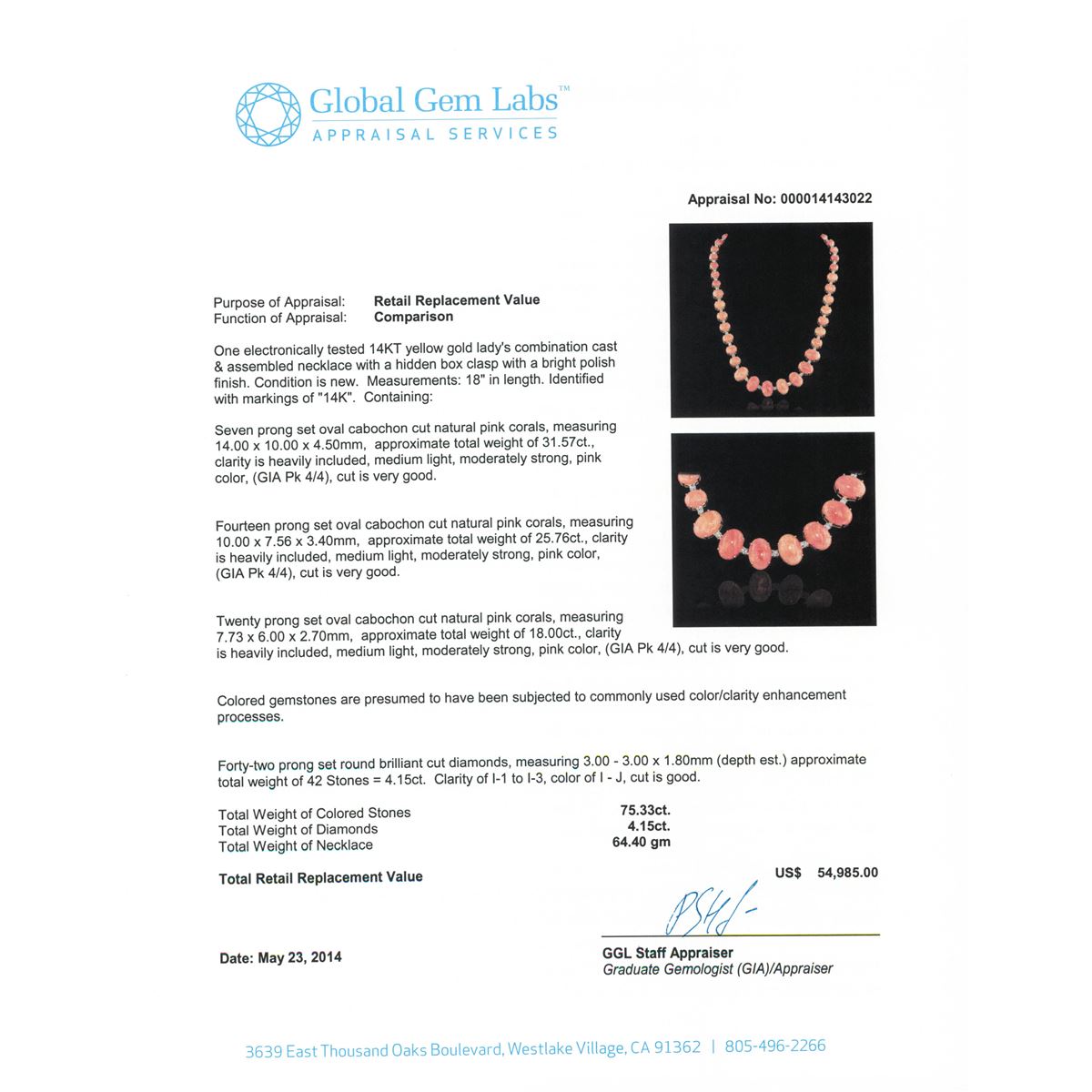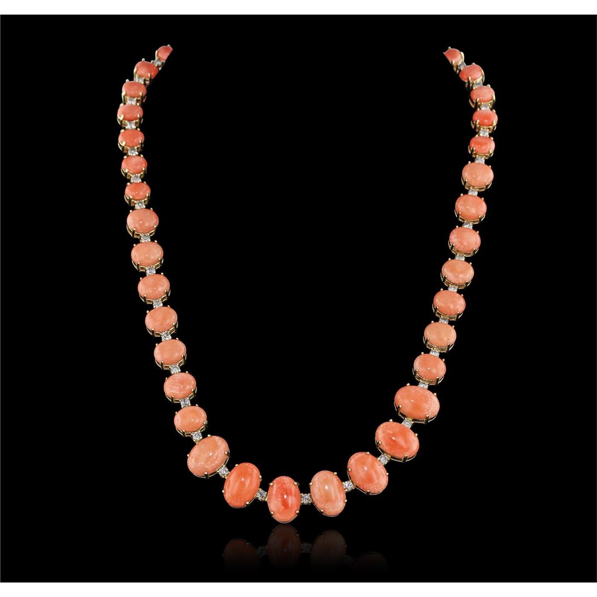 One electronically tested 14KT yellow gold Ladies combination cast & assembled necklace with a hidden box clasp with a bright polish finish. Condition is new. Measurements: 18" in length. Identified with markings of "14K". Containing: Seven prong set oval cabochon cut natural pink corals, measuring 14.00 x 10.00 x 4.50mm, approximate. Total Weight of 31.57ct., clarity is heavily included, medium light, moderately strong, pink color, (GIA Pk 4/4), cut is very good. Fourteen prong set oval cabochon cut natural pink corals, measuring 10.00 x 7.56 x 3.40mm, approximate. Total Weight of 25.76ct., clarity is heavily included, medium light, moderately strong, pink color, (GIA Pk 4/4), cut is very good. Twenty prong set oval cabochon cut natural pink corals, measuring 7.73 x 6.00 x 2.70mm, approximate. Total Weight of 18.00ct., clarity is heavily included, medium light, moderately strong, pink color, (GIA Pk 4/4), cut is very good. Colored gemstones are presumed to have been subjected to commonly used color/clarity enhancement processes. Forty-Two prong set round brilliant cut diamonds, measuring 3.00 - 3.00 x 1.80mm (depth est.) approximate. Total Weight of 42 Stones = 4.15ct. Clarity: I-1 to I-3. Color: I - J, Cut is Good. Total Weight of Colored Stones 75.33ct. Total Weight of Diamonds 4.15ct. Total Weight of Necklace 64.40 grams. GGL Appraised at $54,985.00.