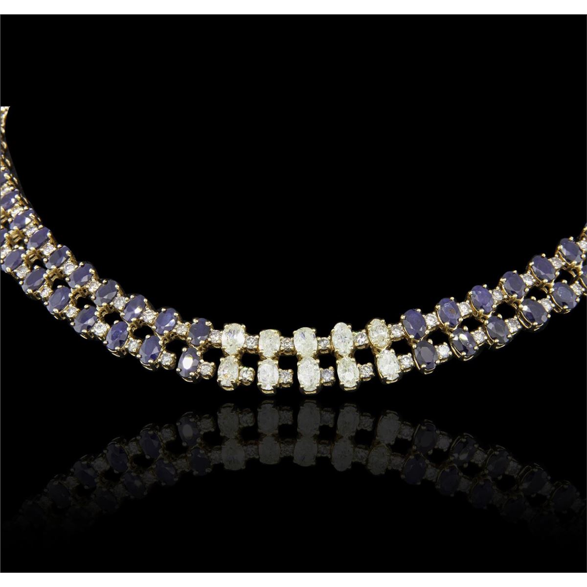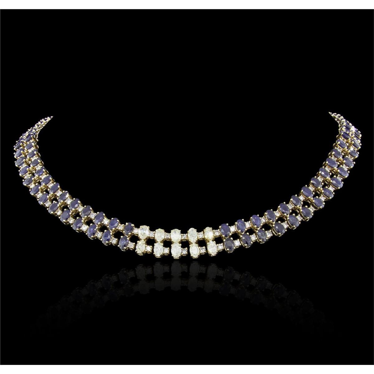 One electronically tested 14KT yellow gold ladies cast & assembled sapphire and diamond necklace with a bright polish finish. Condition is new, good workmanship. Seventeen and one-half inch length necklace features two flexible ribbons consisting of oval sapphires and diamonds interspersed by round brilliant diamonds, terminating in a concealed clasp with safety. Identified with markings of "14K". Containing: One hundred fifty prong set oval mixed cut natural blue sapphires, measuring 6.20 x 4.20 x 2.20mm, 10%. bulge factor, approximate. Total Weight of 78.00ct., clarity is heavily included, type II, dark, moderately strong, violetish blue color, (GIA vB 7/4), cut is good. Transmitting light somewhat diffusely, transparent to translucent. Naturally occurring internal & external characteristics are present. Measurements & the color grade are an average for the group. Indications of multiple laboratory enhancements, including high temperature diffusion treatment. Graded in the setting. Ten prong set oval shaped cut diamonds, measuring 6.20 x 4.20 x 2.65mm (depth est.) approximate. Total Weight of 10 Stones = 4.55ct. Graded in the setting. Clarity: I-1 to I-2. Color: I - K. Sixty-Two prong set round brilliant cut diamonds, measuring 2.60 - 2.50 x 1.53mm (depth est.) approximate. Total Weight of 62 Stones = 3.85ct. Graded in the setting. Clarity: I-1 to I-3. Total Weight of Colored Stones 78.00ct. Total Weight of Diamonds 8.40ct. Total Weight of Necklace 69.92 grams. AIG Appraised at $43,450.00.