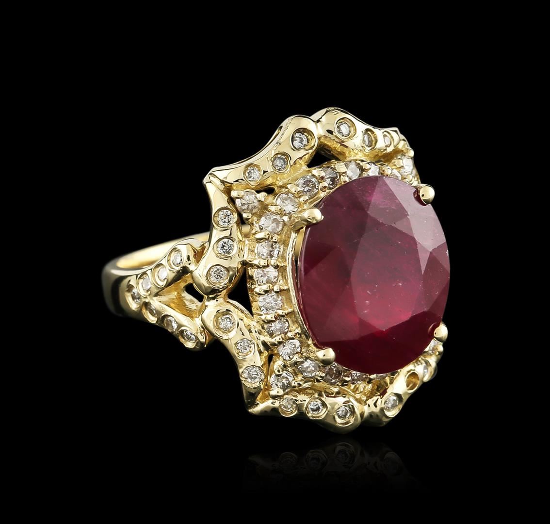 One electronically tested 14KT yellow gold ladies cast ruby and diamond ring with a bright polish finish. Identified with markings of "K14". Condition is new. Containing: One prong set oval modified brilliant cut natural ruby, measuring 12.50 x 10.75 x 7.10mm, approximate weight of 8.01ct., clarity is heavily included, type II, cut is good. Sixty-Six prong set round brilliant cut diamonds, measuring 1.30 - 1.30 x 0.78mm (depth est.) approximate total weight of 66 Stones = 0.53ct. Clarity: SI-2 to I-1. Color: K - L, Cut is Good. Diamonds and colored gemstones are graded in the mounting, unless otherwise stated. Colored gemstones are presumed to have been subjected to commonly used enhancement processes. Total Weight of Colored Stones 8.01ct. Total Weight of Diamonds 0.53ct. Total Weight of Ring 9.90 grams. GGL Appraised at $3,660.00.