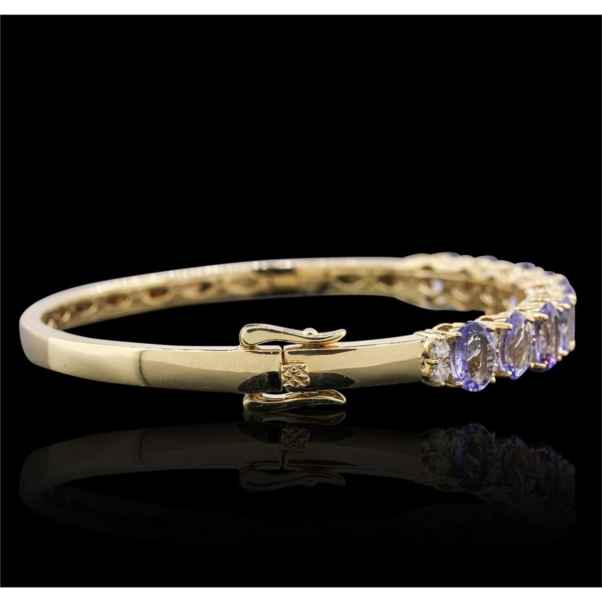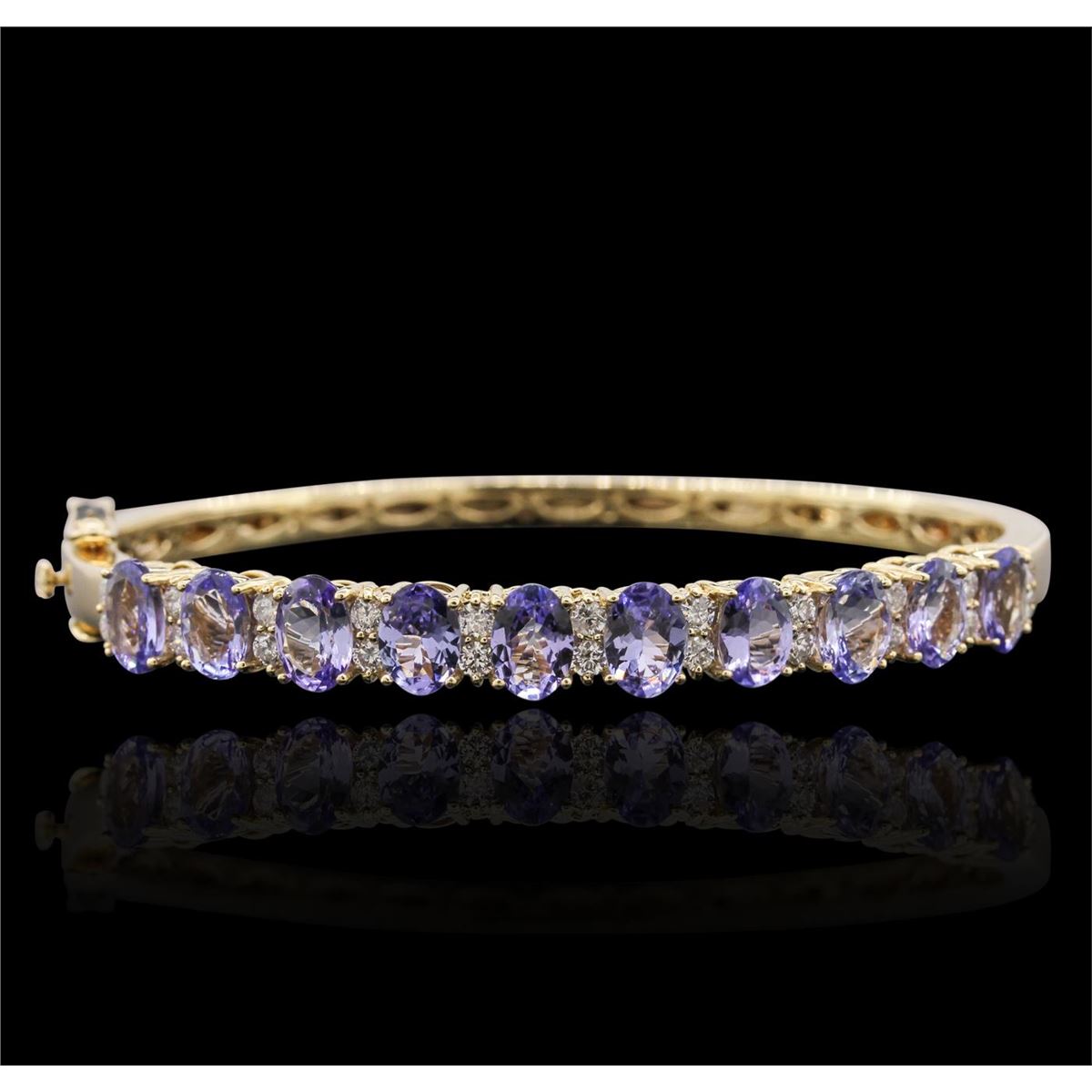 One electronically tested 14KT yellow gold ladies cast tanzanite and diamond bangle bracelet with a bright polish finish. Condition is new, good workmanship. Six and one-half inch length hinged bangle bracelet terminating in a concealed clasp with twin safeties. Identified with markings of "14K". Containing: Ten prong set oval mixed cut natural tanzanites, measuring 7.00 x 5.00 x 3.25mm, 6%. bulge factor, approximate. Total Weight of 8.30ct., clarity is eye clean, type I, medium, very slightly grayish, violet color, (GIA V 5/3), cut is good. Transmitting light with a minimum of distortion, transparent. Measurements & the color grade are an average for the group. Graded in the setting. Tanzanite is a very rare gemstone that is only found in the country of Tanzania. Originally discovered in 1967. Tiffany & Company, named the stone Tanzanite. It is found in the Usumburu Mountains that border the Umba Valley of northern Tanzania. Tanzanite occurs in gray, brown, violet, blue, reddish-purple, & green. The gem is interesting because of its exceptional pleochroism. Rotated in different directions a tanzanite will exhibit multiple changes of color. Tanzanite has a low tolerance to ultrasonic cleaning, and should not be cleaned using this method. Twenty prong set round brilliant cut diamonds, measuring 2.30 - 2.10 x 1.32mm (depth est.) approximate. Total Weight of 20 Stones = 0.87ct. Graded in the setting. Clarity: I-1 to I-2. Color: G - I. Total Weight of Colored Stones 8.30ct. Total Weight of Diamonds 0.87ct. Total Weight of Bangle Bracelet 19.90 grams. AIG Appraised at $9,630.00.