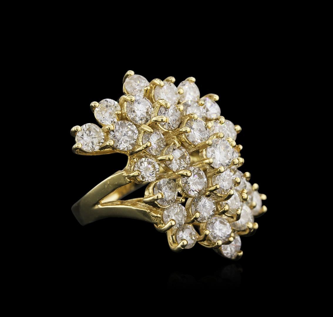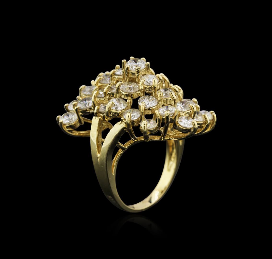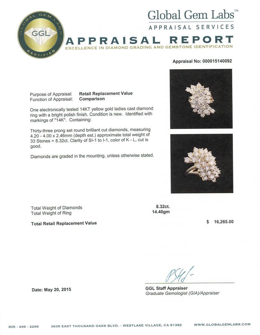 One electronically tested 14KT yellow gold ladies cast diamond ring with a bright polish finish. Identified with markings of "14K". Condition is new. Containing: Thirty-Three prong set round brilliant cut diamonds, measuring 4.20 - 4.00 x 2.46mm (depth est.) approximate total weight of 33 Stones = 8.32ct. Clarity: SI-1 to I-1. Color: K - L, Cut is Good. Diamonds are graded in the mounting, unless otherwise stated. Total Weight of Diamonds 8.32ct. Total Weight of Ring 14.40 grams. GGL Appraised at $16,265.00.