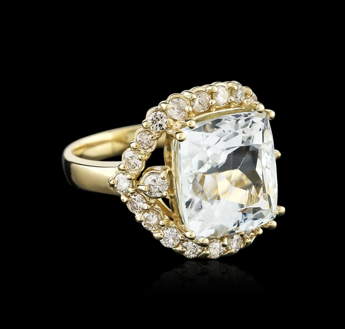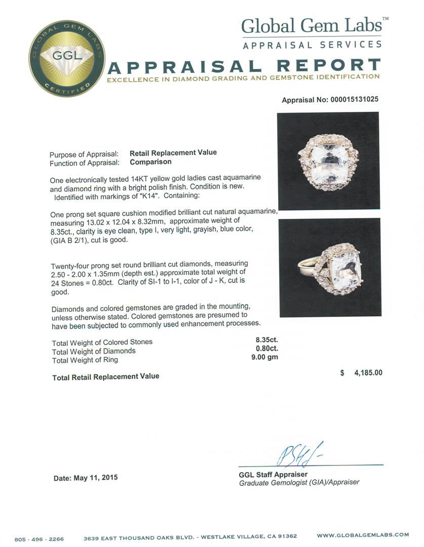 One electronically tested 14KT yellow gold ladies cast aquamarine and diamond ring with a bright polish finish. Identified with markings of "K14". Condition is new. Containing: One prong set square cushion modified brilliant cut natural aquamarine, measur GGL Appraised at $4,185.00.