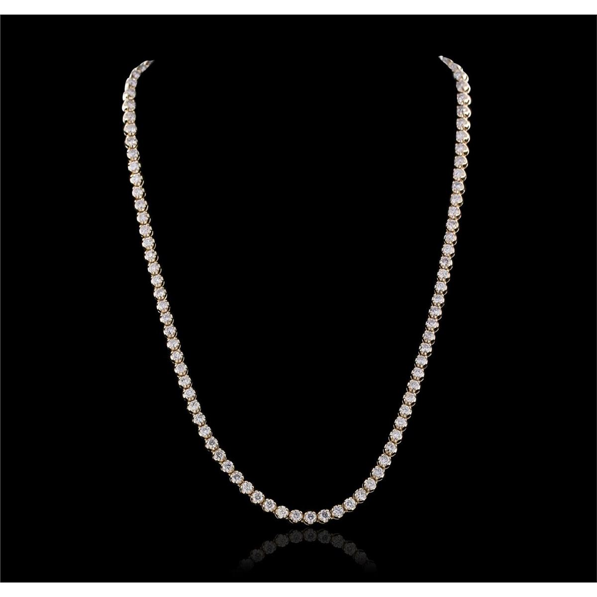One electronically tested 14KT yellow gold ladies combination cast & assembled necklace with a hidden box clasp with a bright polish finish. Condition is new. Measurements: 16.50" in length. Identified with markings of "14K". Containing: One Hundred Four prong set round brilliant cut diamonds, measuring 2.80 - 2.80 x 1.68mm (depth est.) approximate total weight of 104 Stones = 8.35ct. Clarity: I-1 to I-2. Color: I - J, Cut is Good. All diamonds are graded in the mounting, unless otherwise stated. Total Weight of Diamonds 8.35ct. Total Weight of Necklace 26.10 grams. GGL Appraised at $25,315.00.