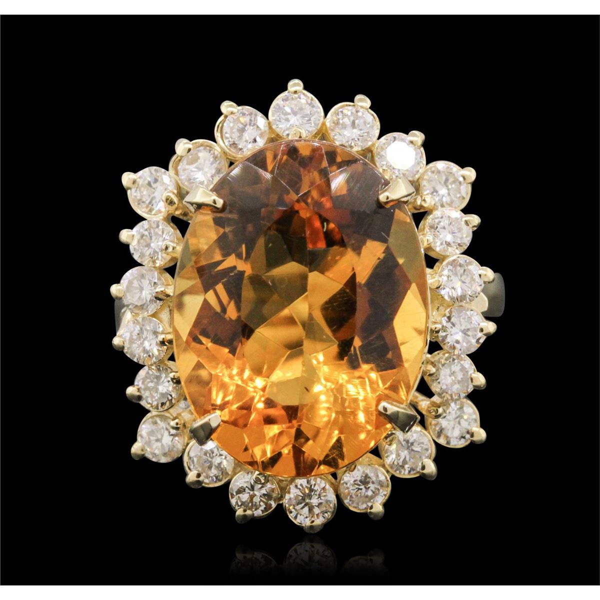 One electronically tested 14KT yellow gold ladies combination cast & assembled ring with a bright polish finish. Condition is new. Identified with markings of "K14". Containing: One prong set oval modified brilliant cut natural citrine quartz, measuring 16.10 x 11.90 x 8.10mm, approximate weight of 8.45ct., clarity is eye clean, type I, medium light, brownish, yellow color, (GIA Y 4/3), cut is good. Twenty-Two prong set round brilliant cut diamonds, measuring 2.20 - 2.20 x 1.32mm (depth est.) approximate. Total Weight of 22 Stones = 0.86ct. Clarity: SI-2 to I-1. Color: J - K, Cut is Good. Colored gemstones are presumed to have been subjected to commonly used enhancement processes. All diamonds and colored gemstones are graded in the mounting, unless otherwise stated. Total Weight of Colored Stones 8.45ct. Total Weight of Diamonds 0.86ct. Total Weight of Ring 7.70 grams. GGL Appraised at $5,100.00.