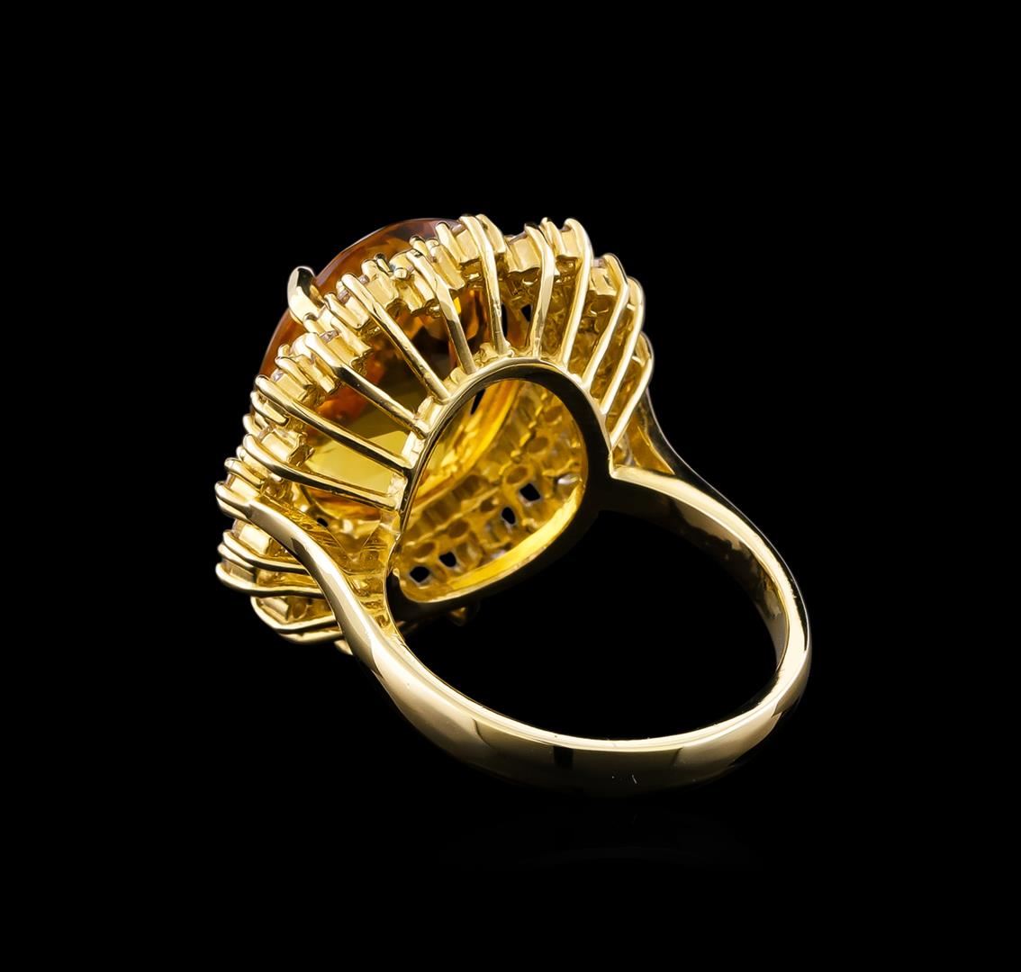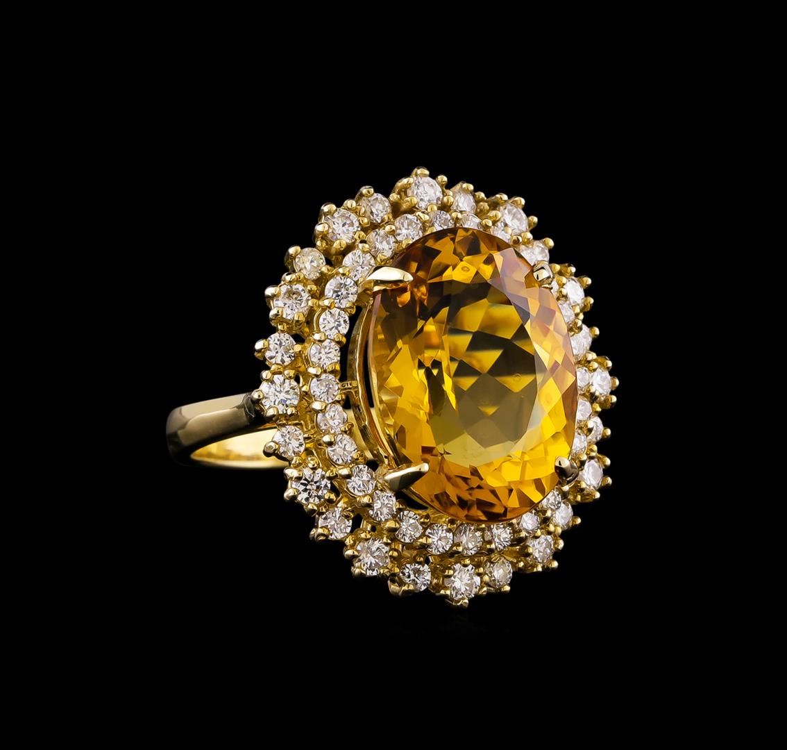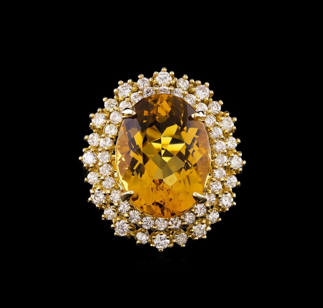 One electronically tested 14KT yellow gold ladies combination cast & assembled citrine and diamond ring with a flat shank with a bright polish finish. Identified with markings of "K14". Condition is new. Containing: One prong set oval modified brilliant cut natural citrine quartz, measuring 16.11 x 12.22 x 8.02mm, approximate weight of 8.56ct., clarity is eye clean, type I, medium light, brownish, orangy yellow color, (GIA oY 4/3), cut is good. Fifty-Two prong set round brilliant cut diamonds, measuring 1.90 - 1.40 x 0.99mm (depth est.) approximate total weight of 52 Stones = 0.85ct. Clarity: SI-1 to SI-2. Color: J - K, Cut is Good. Colored gemstones are presumed to have been subjected to commonly used enhancement processes. All diamonds and colored gemstones are graded in the mounting, unless otherwise stated. Total Weight of Colored Stones 8.56ct. Total Weight of Diamonds 0.85ct. Total Weight of Ring 9.60 grams. GGL Appraised at $4,560.00.