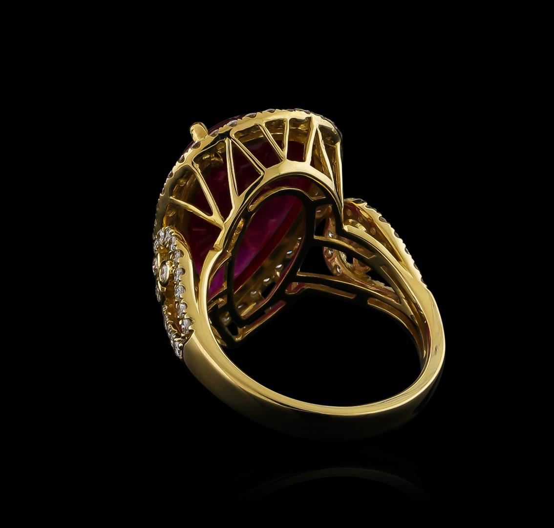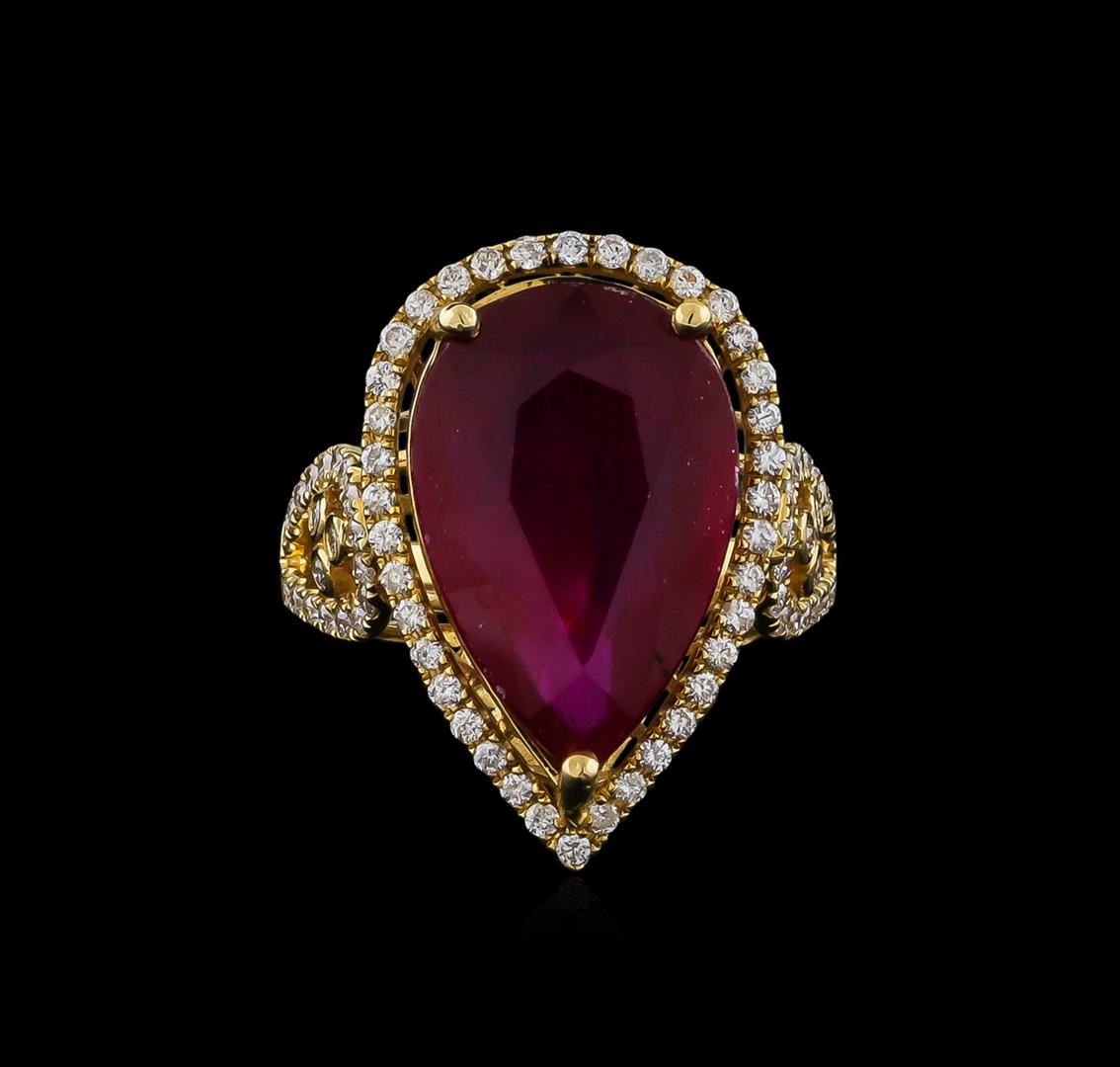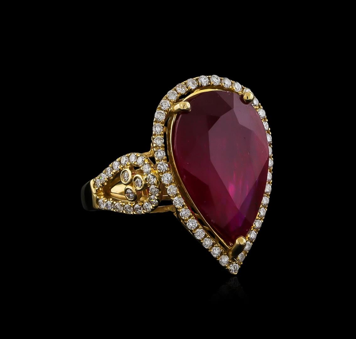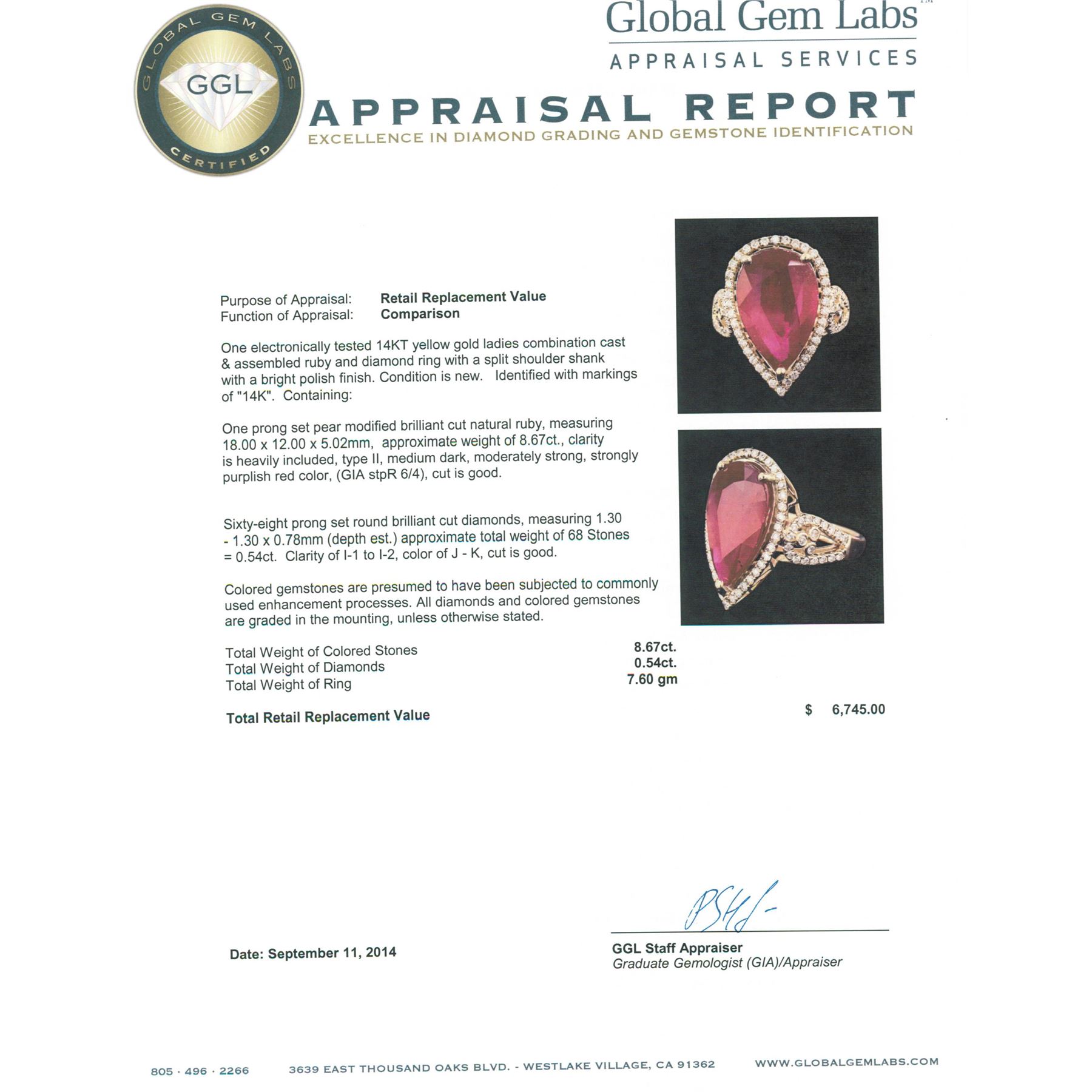 One electronically tested 14KT yellow gold ladies combination cast & assembled ruby and diamond ring with a split shoulder shank with a bright polish finish. Identified with markings of "14K". Condition is new. Containing: One prong set pear modified brilliant cut natural ruby, measuring 18.00 x 12.00 x 5.02mm, approximate weight of 8.67ct., clarity is heavily included, type II, medium dark, moderately strong, strongly purplish red color, (GIA stpR 6/4), cut is good. Sixty-Eight prong set round brilliant cut diamonds, measuring 1.30 - 1.30 x 0.78mm (depth est.) approximate total weight of 68 Stones = 0.54ct. Clarity: I-1 to I-2. Color: J - K, Cut is Good. Colored gemstones are presumed to have been subjected to commonly used enhancement processes. All diamonds and colored gemstones are graded in the mounting, unless otherwise stated. Total Weight of Colored Stones 8.67ct. Total Weight of Diamonds 0.54ct. Total Weight of Ring 7.60 grams. GGL Appraised at $6,745.00.
