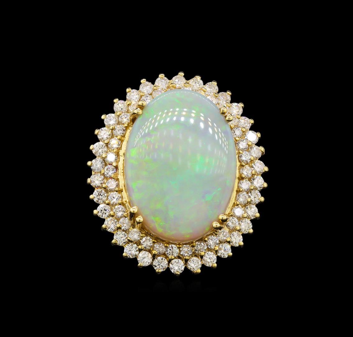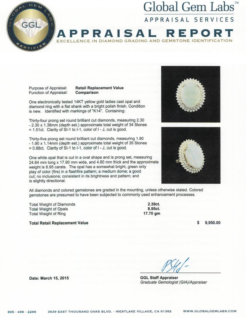 One electronically tested 14KT yellow gold ladies cast opal and diamond ring with a flat shank with a bright polish finish. Identified with markings of "K14". Condition is new. Containing: Thirty-Four prong set round brilliant cut diamonds, measuring 2.30 - 2.30 x 1.38mm (depth est.) approximate total weight of 34 Stones = 1.51ct. Clarity of SI-1 to I-1, Color of I - J, Cut is Good. Thirty-Five prong set round brilliant cut diamonds, measuring 1.90 - 1.90 x 1.14mm (depth est.) approximate total weight of 35 Stones = 0.88ct. Clarity of SI-1 to I-1, Color of I - J, Cut is Good. One white opal that is cut in a oval shape and is prong set, measuring 24.64 mm long x 17.90 mm wide, and 4.60 mm thick and the approximate weight is 8.95 carats. The opal has a somewhat bright, green only play of color (fire) in a flashfire pattern; a medium dome; a good cut; no inclusions; consistent in its brightness and pattern; and is slightly directional. All diamonds and colored gemstones are graded in the mounting, unless otherwise stated. Colored gemstones are presumed to have been subjected to commonly used enhancement processes. Total Weight of Diamonds 2.39ct. Total Weight of Opals 8.95ct. Total Weight of Ring 17.70 grams. GGL Appraised at $9,950.00.
