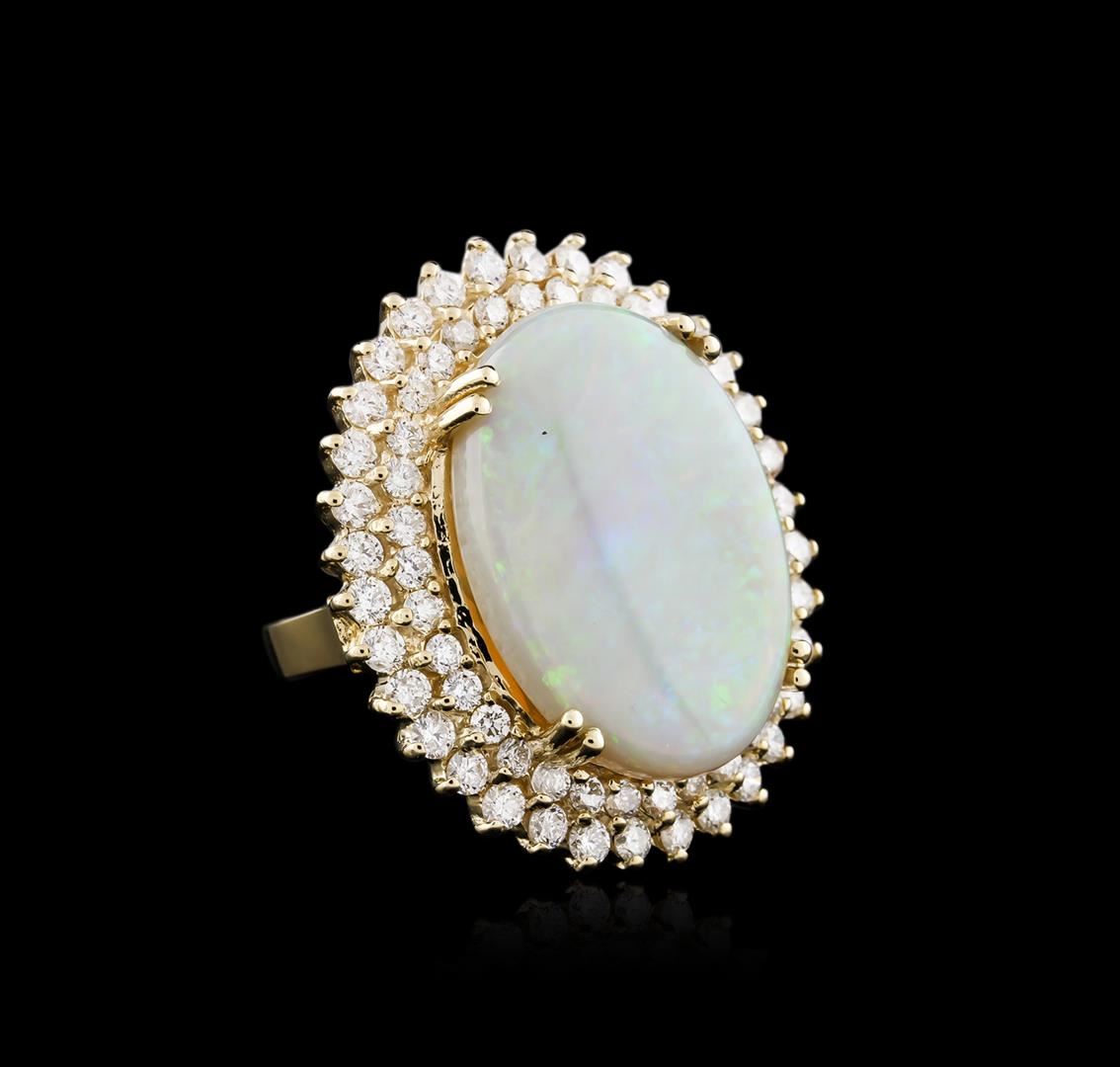 One electronically tested 14KT yellow gold ladies cast opal and diamond ring with a flat shank with a bright polish finish. Identified with markings of "K14". Condition is new. Containing: Thirty-Four prong set round brilliant cut diamonds, measuring 2.30 - 2.30 x 1.38mm (depth est.) approximate total weight of 34 Stones = 1.51ct. Clarity of SI-1 to I-1, Color of I - J, Cut is Good. Thirty-Five prong set round brilliant cut diamonds, measuring 1.90 - 1.90 x 1.14mm (depth est.) approximate total weight of 35 Stones = 0.88ct. Clarity of SI-1 to I-1, Color of I - J, Cut is Good. One white opal that is cut in a oval shape and is prong set, measuring 24.64 mm long x 17.90 mm wide, and 4.60 mm thick and the approximate weight is 8.95 carats. The opal has a somewhat bright, green only play of color (fire) in a flashfire pattern; a medium dome; a good cut; no inclusions; consistent in its brightness and pattern; and is slightly directional. All diamonds and colored gemstones are graded in the mounting, unless otherwise stated. Colored gemstones are presumed to have been subjected to commonly used enhancement processes. Total Weight of Diamonds 2.39ct. Total Weight of Opals 8.95ct. Total Weight of Ring 17.70 grams. GGL Appraised at $9,950.00.