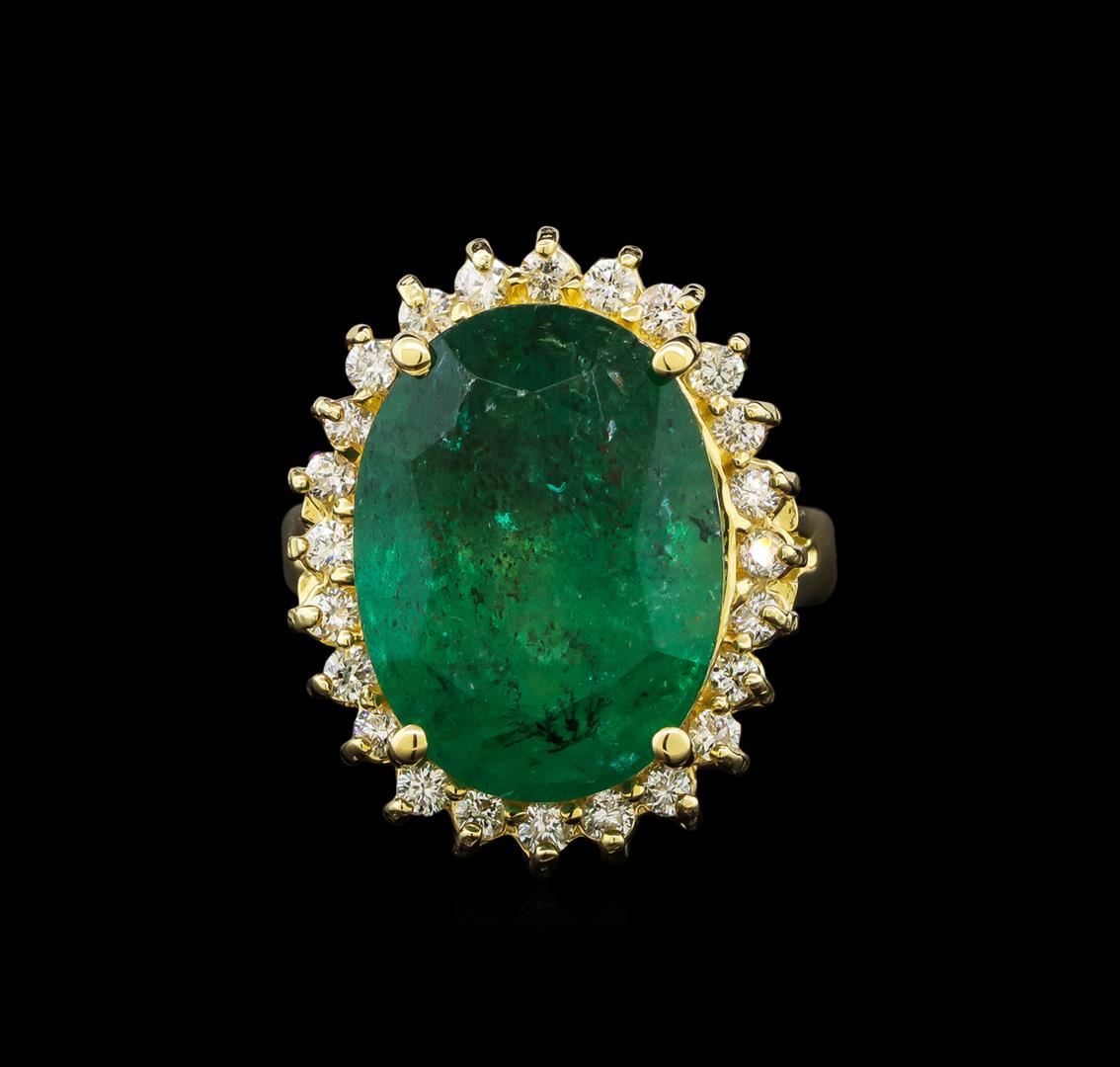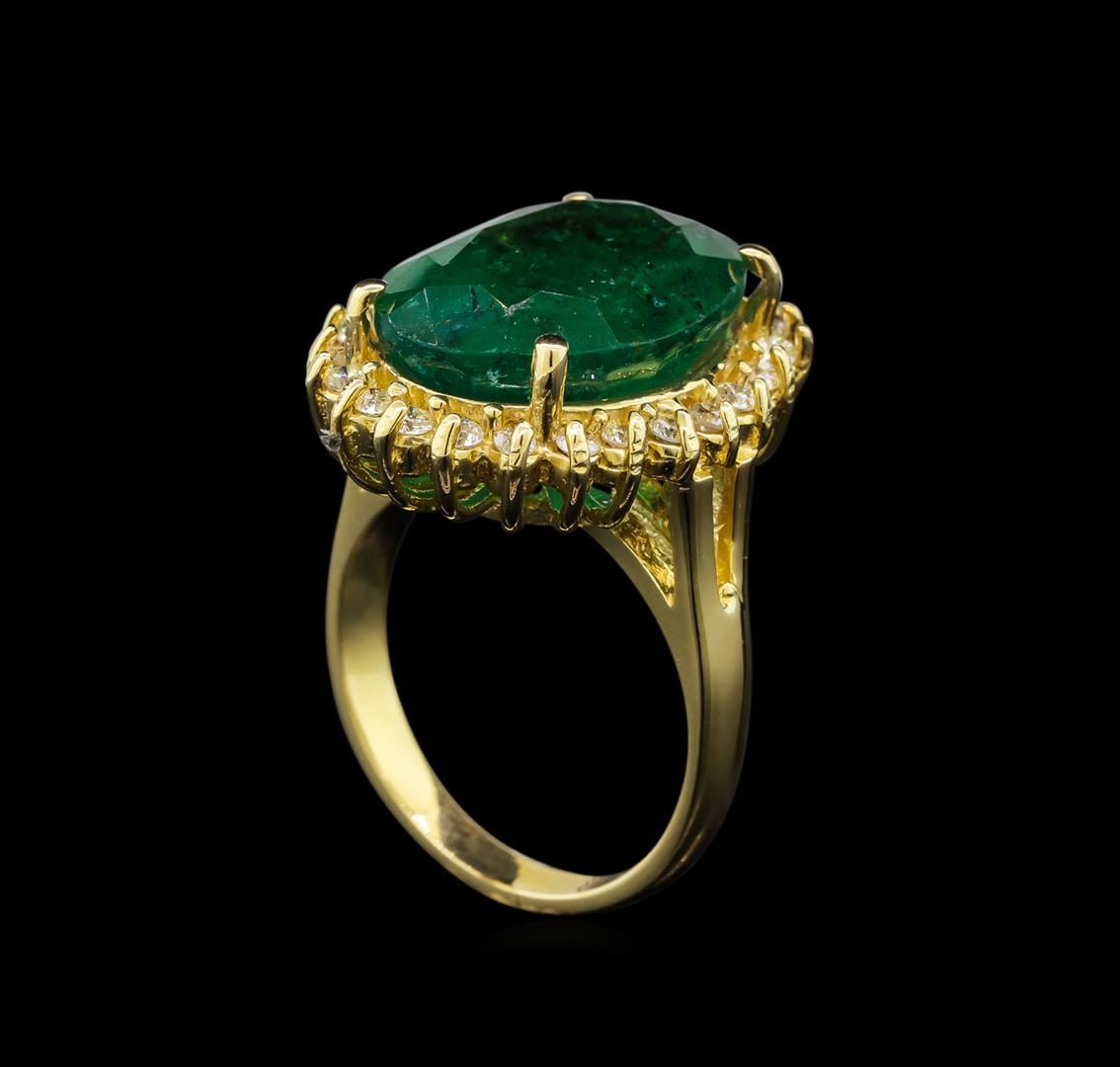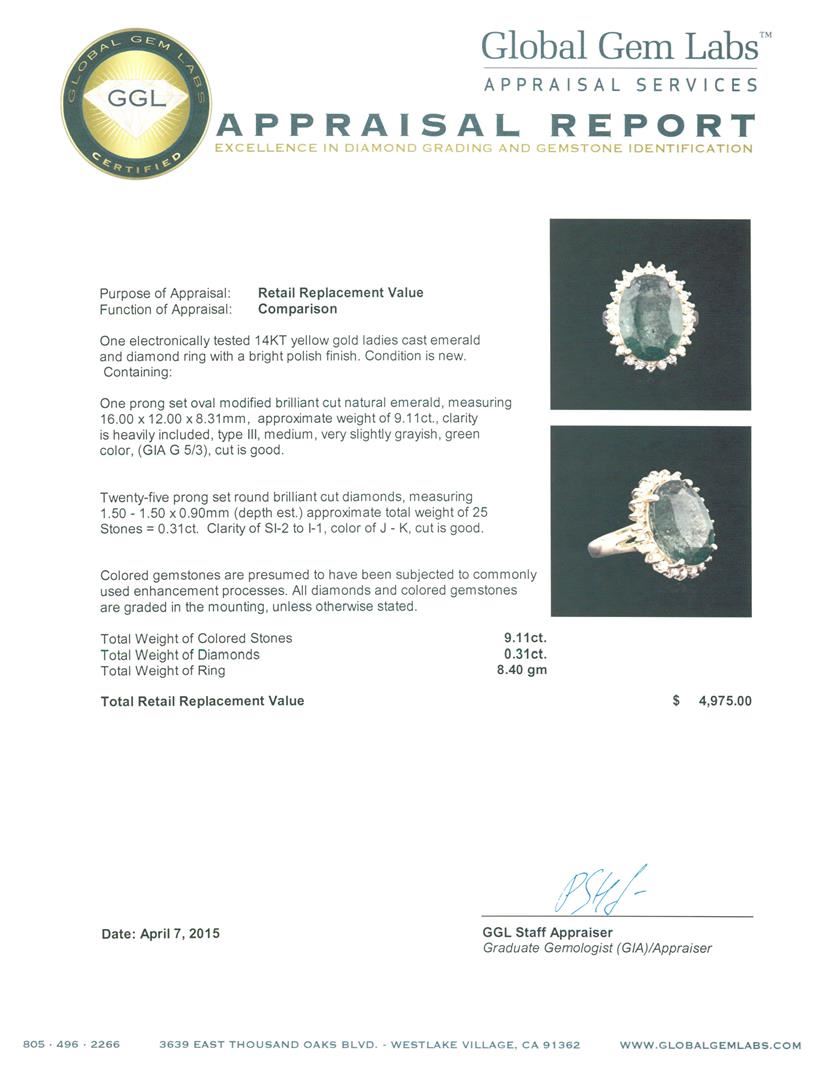 One electronically tested 14KT yellow gold ladies cast emerald and diamond ring with a bright polish finish. Condition is new. Containing: One prong set oval modified brilliant cut natural emerald, measuring 16.00. x 12.00. x 8.31mm, approximate weight of 9.11ct., clarity is heavily included, type III, medium, very slightly grayish, green color, (GIA G 5/3), cut is good. Twenty-Five prong set round brilliant cut diamonds, measuring 1.50 - 1.50 x 0.90mm (depth est.) approximate total weight of 25 Stones = 0.31ct. Clarity: SI-2 to I-1. Color: J - K, Cut is Good. Colored gemstones are presumed to have been subjected to commonly used enhancement processes. All diamonds and colored gemstones are graded in the mounting, unless otherwise stated. Total Weight of Colored Stones 9.11ct. Total Weight of Diamonds 0.31ct. Total Weight of Ring 8.40 grams. GGL Appraised at $4,975.00.