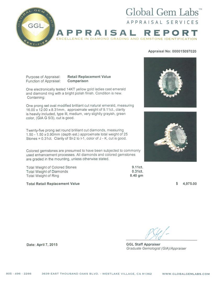 One electronically tested 14KT yellow gold ladies cast emerald and diamond ring with a bright polish finish. Condition is new. Containing: One prong set oval modified brilliant cut natural emerald, measuring 16.00. x 12.00. x 8.31mm, approximate weight of 9.11ct., clarity is heavily included, type III, medium, very slightly grayish, green color, (GIA G 5/3), cut is good. Twenty-Five prong set round brilliant cut diamonds, measuring 1.50 - 1.50 x 0.90mm (depth est.) approximate total weight of 25 Stones = 0.31ct. Clarity: SI-2 to I-1. Color: J - K, Cut is Good. Colored gemstones are presumed to have been subjected to commonly used enhancement processes. All diamonds and colored gemstones are graded in the mounting, unless otherwise stated. Total Weight of Colored Stones 9.11ct. Total Weight of Diamonds 0.31ct. Total Weight of Ring 8.40 grams. GGL Appraised at $4,975.00.