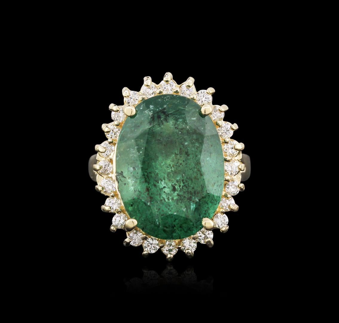 One electronically tested 14KT yellow gold ladies cast emerald and diamond ring with a bright polish finish. Condition is new. Containing: One prong set oval modified brilliant cut natural emerald, measuring 16.00. x 12.00. x 8.31mm, approximate weight of 9.11ct., clarity is heavily included, type III, medium, very slightly grayish, green color, (GIA G 5/3), cut is good. Twenty-Five prong set round brilliant cut diamonds, measuring 1.50 - 1.50 x 0.90mm (depth est.) approximate total weight of 25 Stones = 0.31ct. Clarity: SI-2 to I-1. Color: J - K, Cut is Good. Colored gemstones are presumed to have been subjected to commonly used enhancement processes. All diamonds and colored gemstones are graded in the mounting, unless otherwise stated. Total Weight of Colored Stones 9.11ct. Total Weight of Diamonds 0.31ct. Total Weight of Ring 8.40 grams. GGL Appraised at $4,975.00.