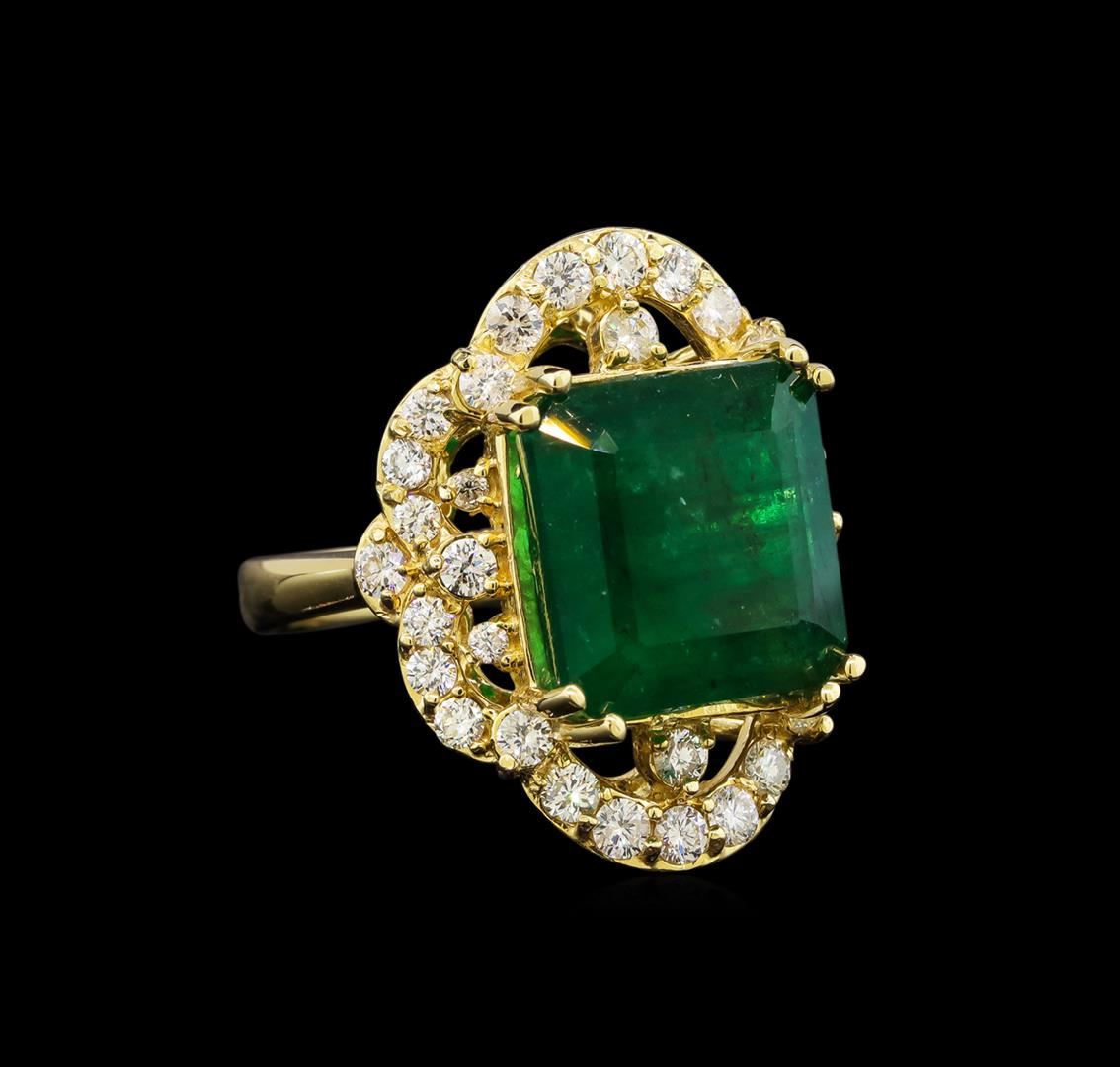 One electronically tested 14KT yellow gold ladies cast emerald and diamond ring with a bright polish finish. Identified with markings of "14K". Condition is new. Containing: One prong set emerald standard step cut natural emerald, measuring 12.70 x 12.00. x 8.31mm, approximate weight of 9.30ct., clarity is heavily included, type III, medium dark, strong, green color, (GIA G 6/5), cut is good. Twenty-One prong set round brilliant cut diamonds, measuring 2.10 - 2.10 x 1.26mm (depth est.) approximate total weight of 21 Stones = 0.71ct. Clarity: SI-1 to SI-2. Color: I - J, Cut is Good. Colored gemstones are presumed to have been subjected to commonly used enhancement processes. All diamonds and colored gemstones are graded in the mounting, unless otherwise stated. Total Weight of Colored Stones 9.30ct. Total Weight of Diamonds 0.71ct. Total Weight of Ring 10.60 grams. GGL Appraised at $6,270.00.