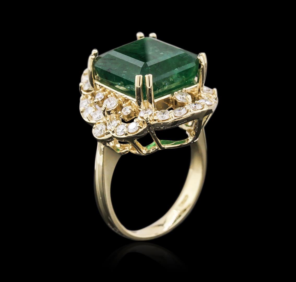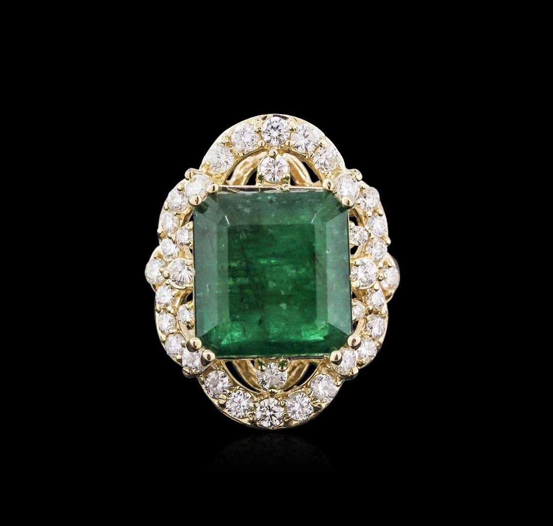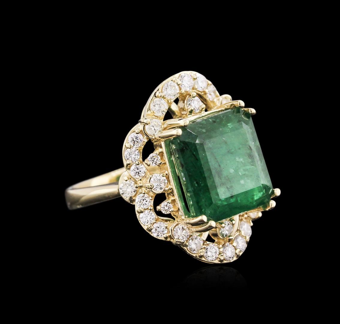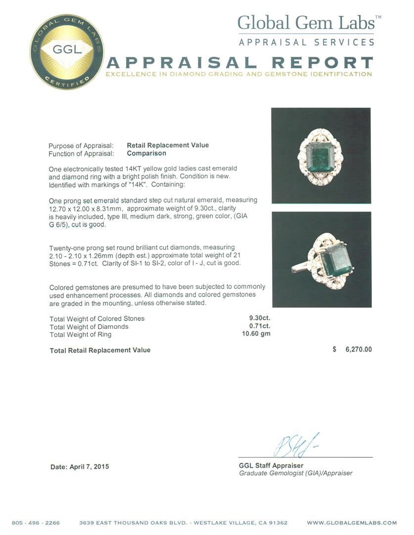 One electronically tested 14KT yellow gold ladies cast emerald and diamond ring with a bright polish finish. Identified with markings of "14K". Condition is new. Containing: One prong set emerald standard step cut natural emerald, measuring 12.70 x 12.00. x 8.31mm, approximate weight of 9.30ct., clarity is heavily included, type III, medium dark, strong, green color, (GIA G 6/5), cut is good. Twenty-One prong set round brilliant cut diamonds, measuring 2.10 - 2.10 x 1.26mm (depth est.) approximate total weight of 21 Stones = 0.71ct. Clarity: SI-1 to SI-2. Color: I - J, Cut is Good. Colored gemstones are presumed to have been subjected to commonly used enhancement processes. All diamonds and colored gemstones are graded in the mounting, unless otherwise stated. Total Weight of Colored Stones 9.30ct. Total Weight of Diamonds 0.71ct. Total Weight of Ring 10.60 grams. GGL Appraised at $6,270.00.