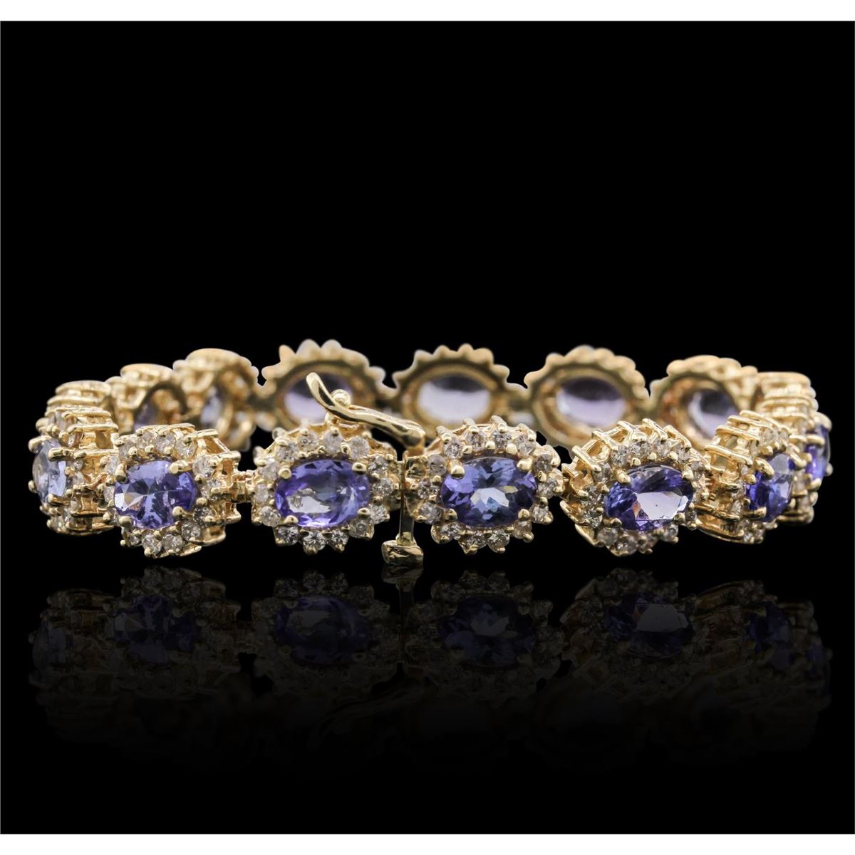 One electronically tested 14KT yellow gold Ladies combination cast & assembled bracelet with a hidden box clasp with a bright polish finish. Measurements: 6.75" in length. Identified with markings of "14K". Condition is new. Containing: Fifteen prong set oval modified brilliant cut natural tanzanites, measuring 7.00 x 5.00 x 2.60mm, approximate. Total Weight of 9.45ct., clarity is eye clean, type I, medium light, very slightly grayish, violet color, (GIA V 4/3), cut is good. Colored gemstones are presumed to have been subjected to commonly used color/clarity enhancement processes. Two Hundred Ten prong set round brilliant cut diamonds, measuring 1.50 - 1.50 x 0.90mm (depth est.) approximate. Total Weight of 210 Stones = 2.58ct. Clarity: I-1 to I-2. Color: J - K, Cut is Good. Total Weight of Colored Stones 9.45ct. Total Weight of Diamonds 2.58ct. Total Weight of Bracelet 22.40 grams. GGL Appraised at $20,650.00.