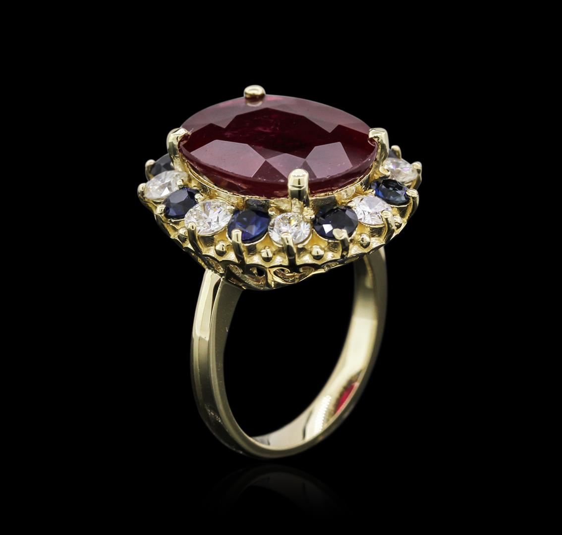 One electronically tested 14KT yellow gold ladies cast ruby, sapphire and diamond ring with a bright polish finish. Identified with markings of "K14". Condition is new. Containing: One prong set oval modified brilliant cut natural ruby, measuring 15.90 x 13.07 x 5.53mm, approximate weight of 9.65ct., clarity is heavily included, type II, medium dark, very slightly brownish, strongly purplish red color, (GIA stpR 6/3), cut is good. Eight prong set round modified brilliant cut natural blue sapphires, measuring 3.00 - 3.00 x 1.95 mm, approximate total weight of 1.12ct., clarity is eye clean, type II, medium, moderately strong, blue color, (GIA B 5/4), cut is good. Eight prong set round brilliant cut diamonds, measuring 3.50 - 3.50 x 2.10mm (depth est.) approximate total weight of 8 Stones = 1.26ct. Clarity: SI-1 to SI-2. Color: J - K, Cut is Good. Diamonds and colored gemstones are graded in the mounting, unless otherwise stated. Colored gemstones are presumed to have been subjected to commonly used enhancement processes. Total Weight of Colored Stones 10.77ct. Total Weight of Diamonds 1.26ct. Total Weight of Ring 9.50 grams. GGL Appraised at $5,030.00.