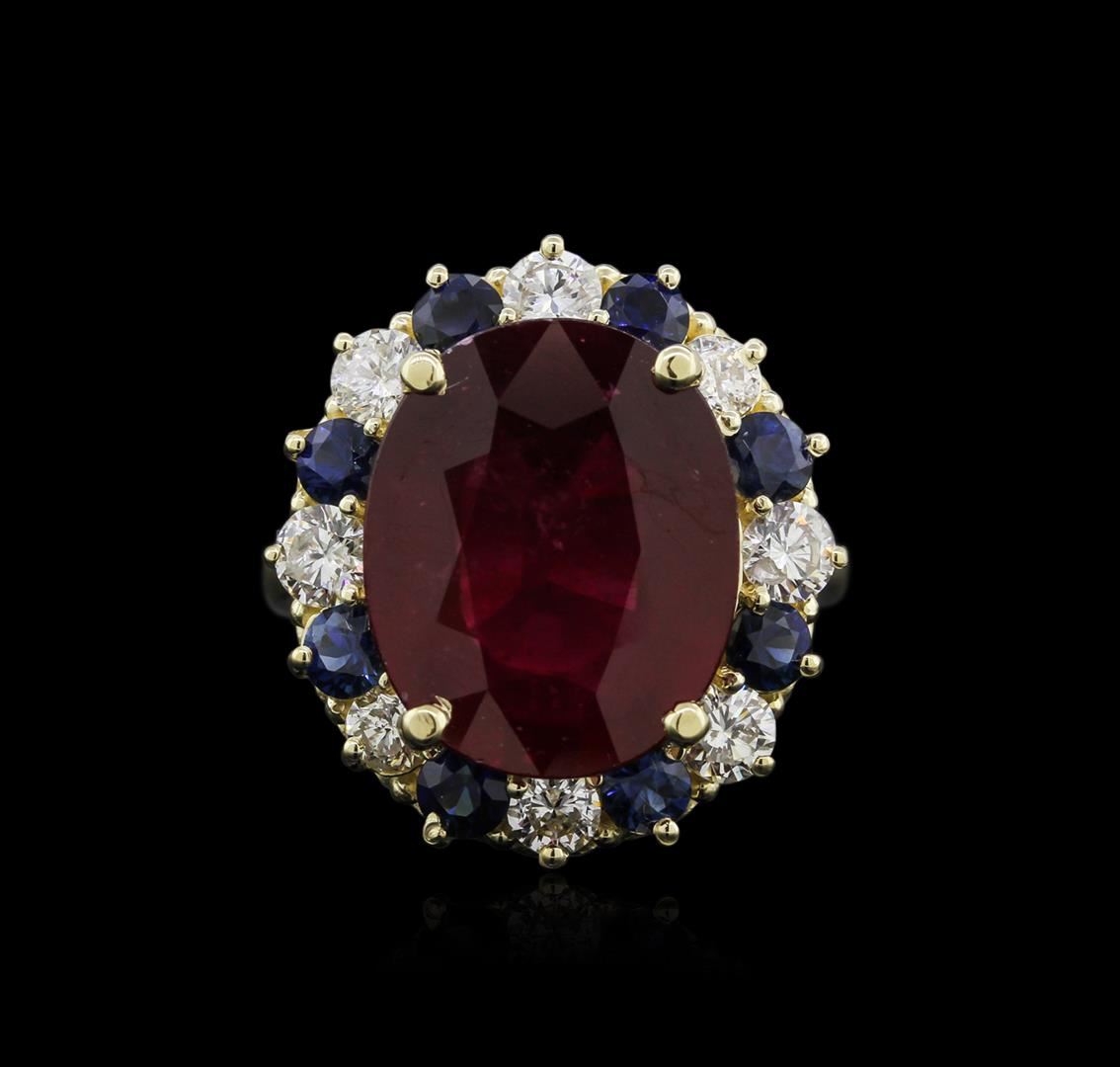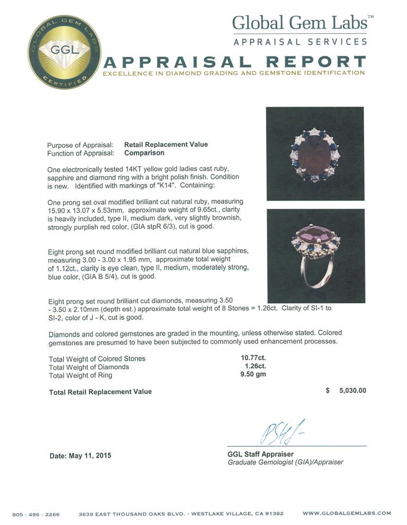 One electronically tested 14KT yellow gold ladies cast ruby, sapphire and diamond ring with a bright polish finish. Identified with markings of "K14". Condition is new. Containing: One prong set oval modified brilliant cut natural ruby, measuring 15.90 x 13.07 x 5.53mm, approximate weight of 9.65ct., clarity is heavily included, type II, medium dark, very slightly brownish, strongly purplish red color, (GIA stpR 6/3), cut is good. Eight prong set round modified brilliant cut natural blue sapphires, measuring 3.00 - 3.00 x 1.95 mm, approximate total weight of 1.12ct., clarity is eye clean, type II, medium, moderately strong, blue color, (GIA B 5/4), cut is good. Eight prong set round brilliant cut diamonds, measuring 3.50 - 3.50 x 2.10mm (depth est.) approximate total weight of 8 Stones = 1.26ct. Clarity: SI-1 to SI-2. Color: J - K, Cut is Good. Diamonds and colored gemstones are graded in the mounting, unless otherwise stated. Colored gemstones are presumed to have been subjected to commonly used enhancement processes. Total Weight of Colored Stones 10.77ct. Total Weight of Diamonds 1.26ct. Total Weight of Ring 9.50 grams. GGL Appraised at $5,030.00.